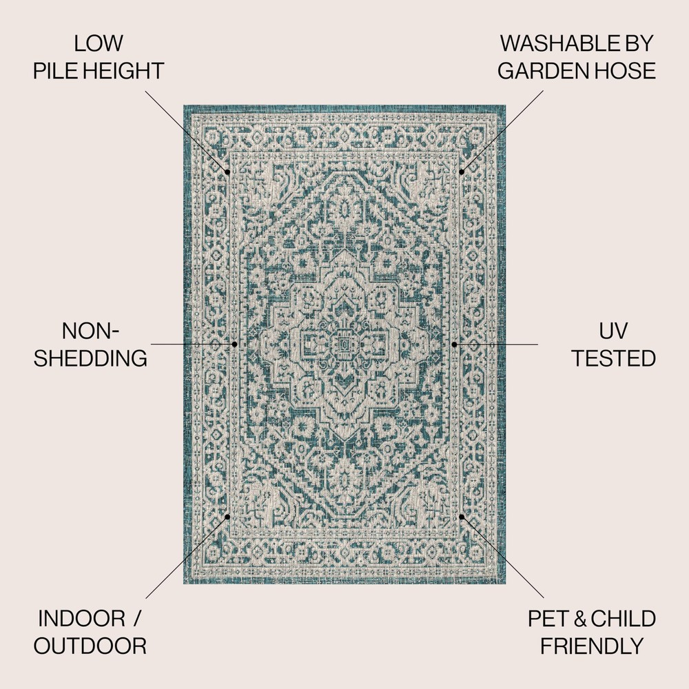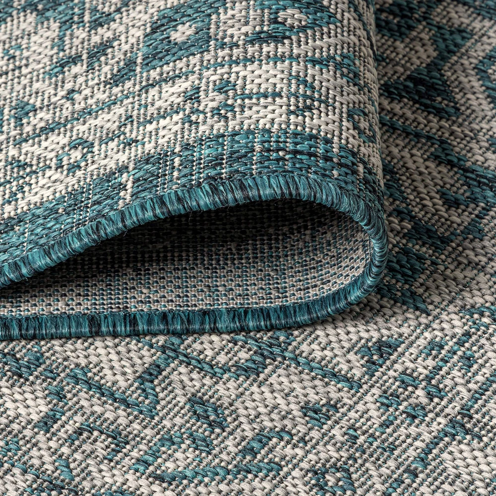 This ornate medallion rug's lively Pattern adds exotic style to an outdoor porch or patio. Varied tones of teal and dark Blue mingled with a gray pattern give this rug a hand-woven, vintage vibe. The flatweave design is great for high-traffic spaces indoors too. INDOOR/OUTDOOR DURABILITY: Give your patio, deck or porch an instant makeover with an indoor/outdoor rug; Low-pile synthetic rug fibers are durable for high-traffic spaces like the kitchen, mud room or entry; Perfect for families with kids STAIN-RESISTANT AND PET-FRIENDLY: This rug is made from synthetic fibers that resist UV fading; The pet-friendly low-pile construction won’t accumulate dirt, and spills clean up easily; It’s been machine-woven so the rug fibers will stay put EASY TO CARE FOR: To wash an outdoor rug, spray the surface with a 5-1 mixture of mild dish soap and water; Then rise thoroughly with a garden hose and hang over a railing to dry thoroughly Flat-weave construction of 100% polypropylene Deep teal blue and gray with a handwoven mingled texture