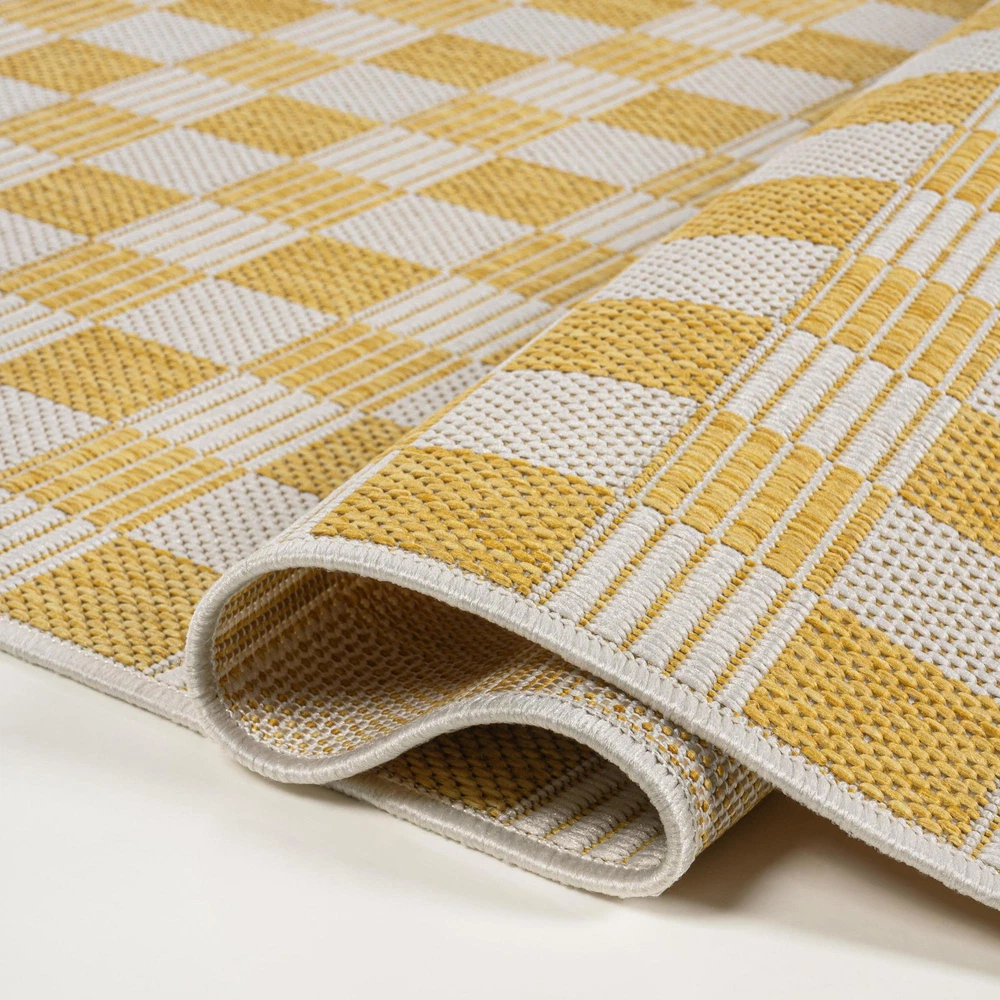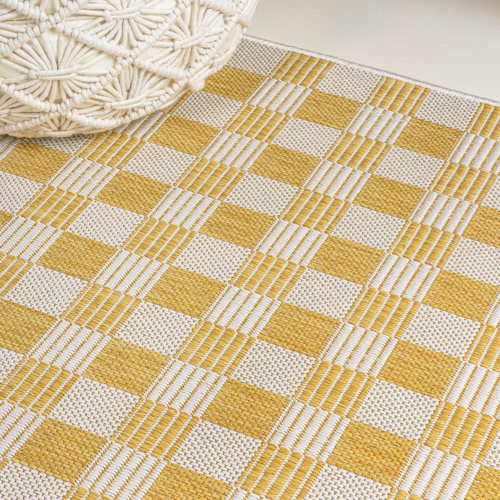 This rug is a game-changer for both indoor and outdoor spaces! The beautiful salmon and cream plaid pattern adds a cozy, rustic charm, while the polypropylene material makes it super durable and easy to clean. Perfect for high-traffic areas, it looks great on my patio but would work just as well in a living room or bedroom. The colors are vibrant, and the texture is soft yet sturdy. Such a stylish and practical choice—love it!