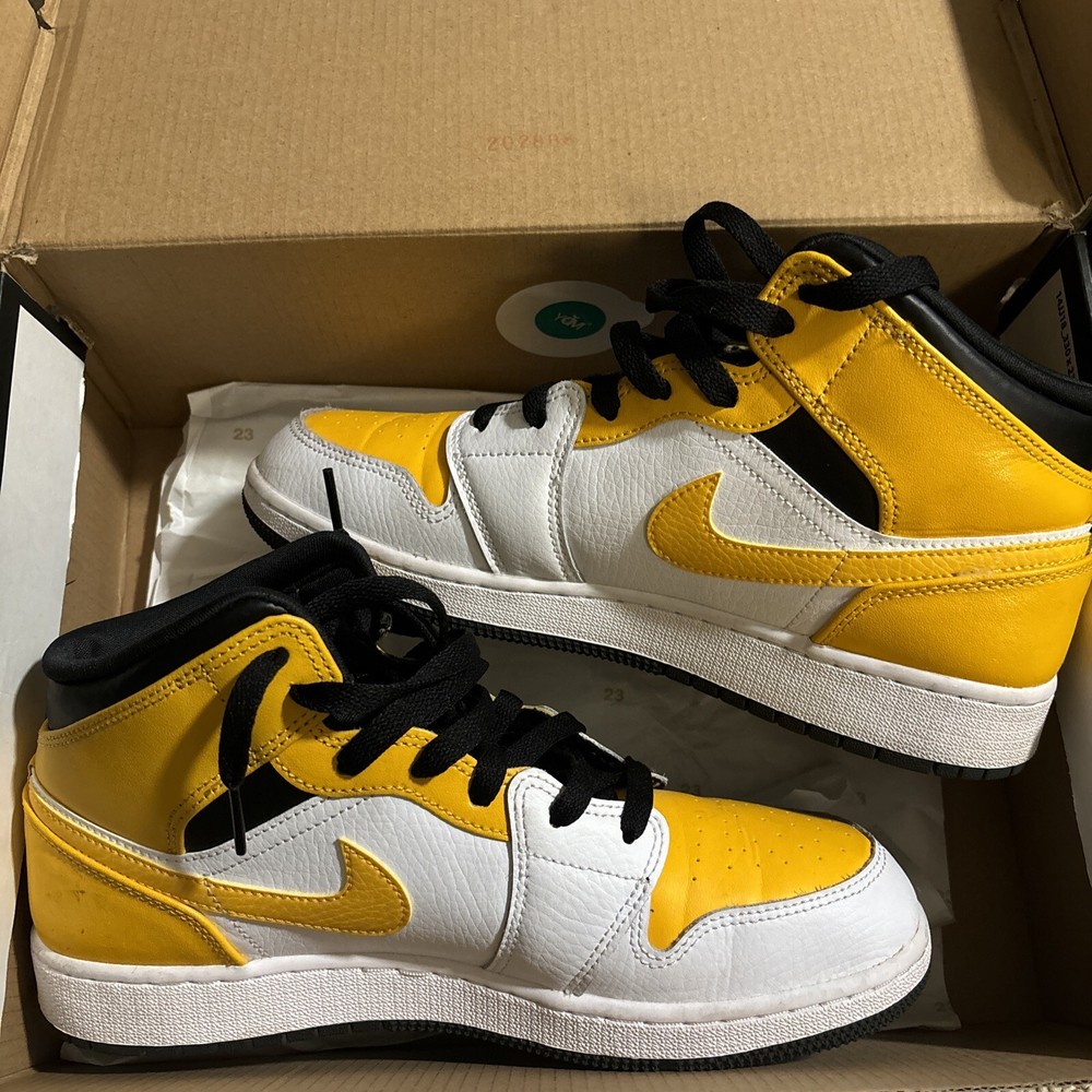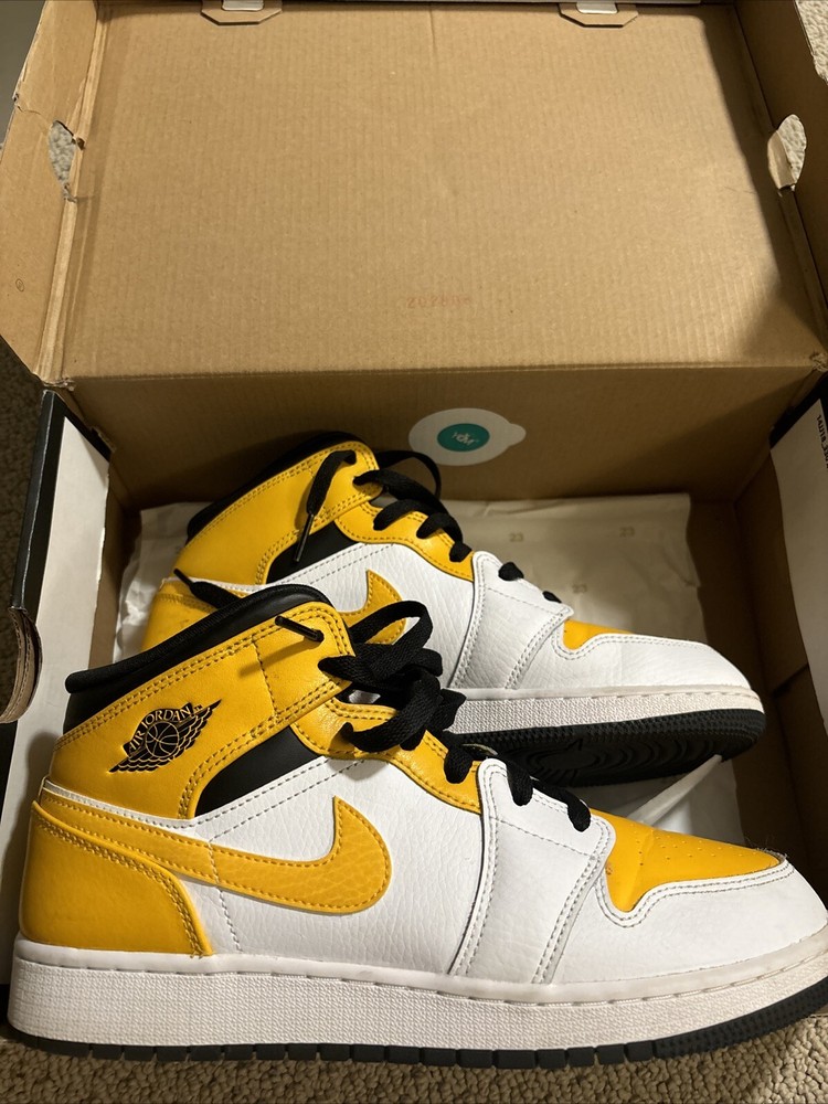 Jordan 1 Mid Yellow sneakers. Designed with a mid-top silhouette, these shoes are perfect for any casual or athletic occasion. The iconic Air Jordan product line ensures high-quality materials and construction, while the retro theme adds a touch of nostalgia to your outfit. Featuring a standard shoe width and size 8.5, these sneakers are made for men or women who appreciate both comfort and style. The vibrant yellow color and Michael character add a unique touch to these shoes, making them a must-have for any sneakerhead. Don't miss out on the opportunity to add these Jordan 1 Mid sneakers to your collection.