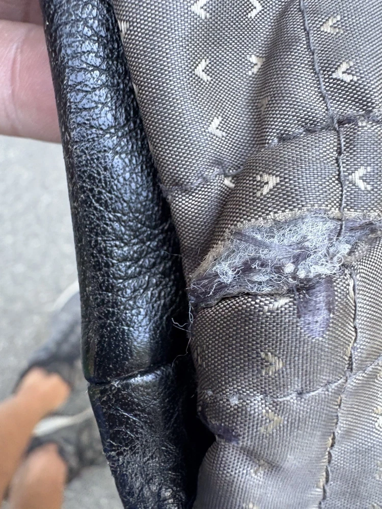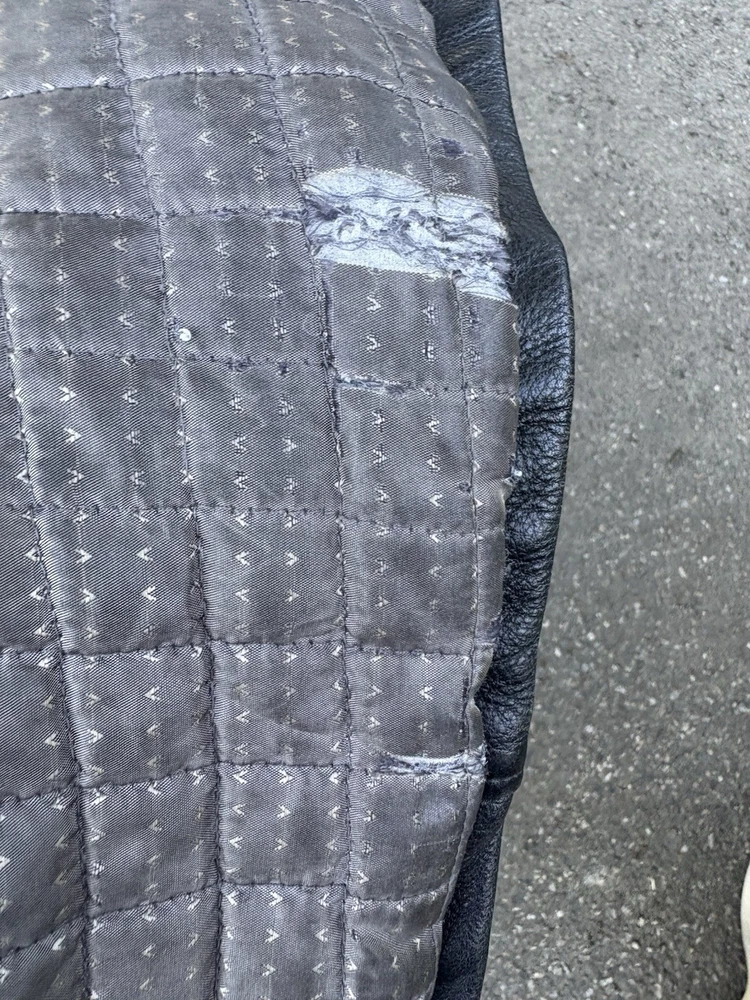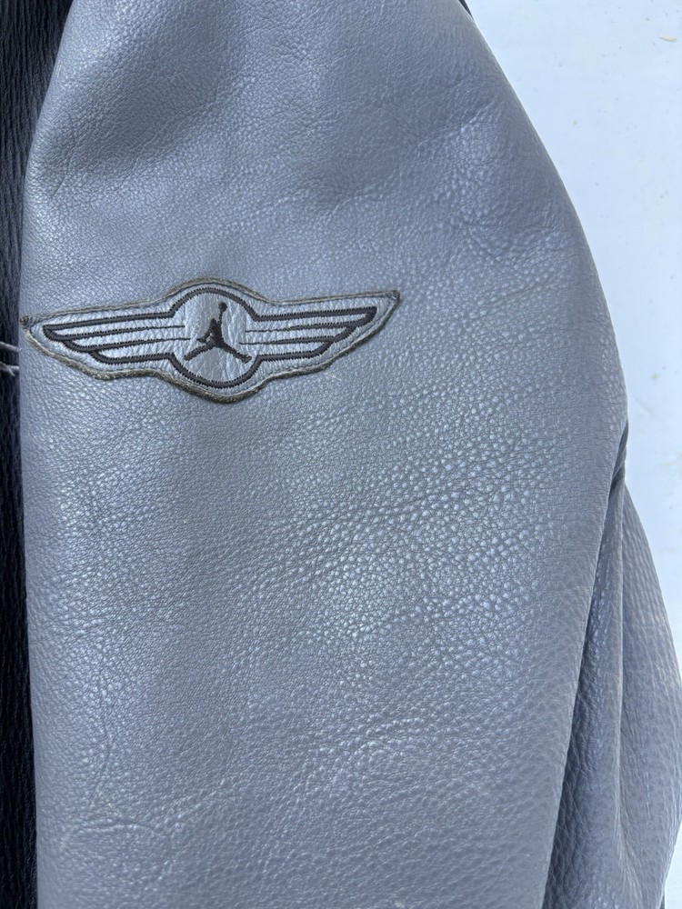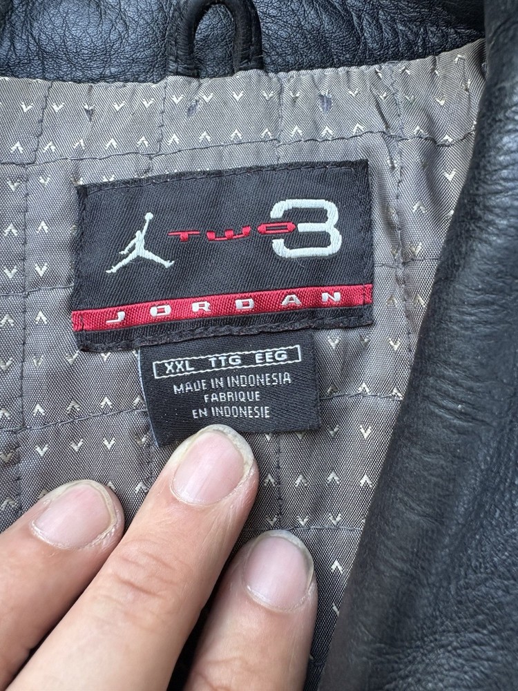 The product is a Jordan 23 Black Leather Jacket in size 2XL. Made with high-quality leather, this jacket features the iconic Jordan brand logo and is designed for men. The sleek black color adds a stylish touch to any outfit, making it a versatile and fashionable addition to any wardrobe. Perfect for those looking for a combination of luxury and streetwear fashion. Note fraying in the inside of jacket. Also the two front pockets have holes in them. Made in Indonesia.
