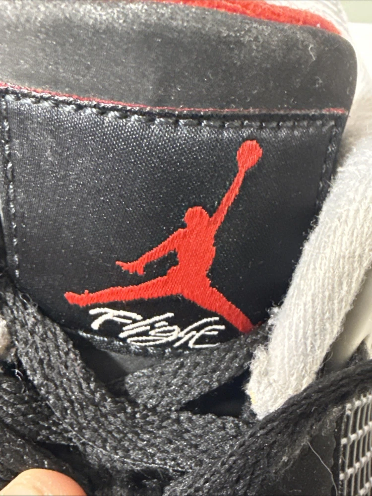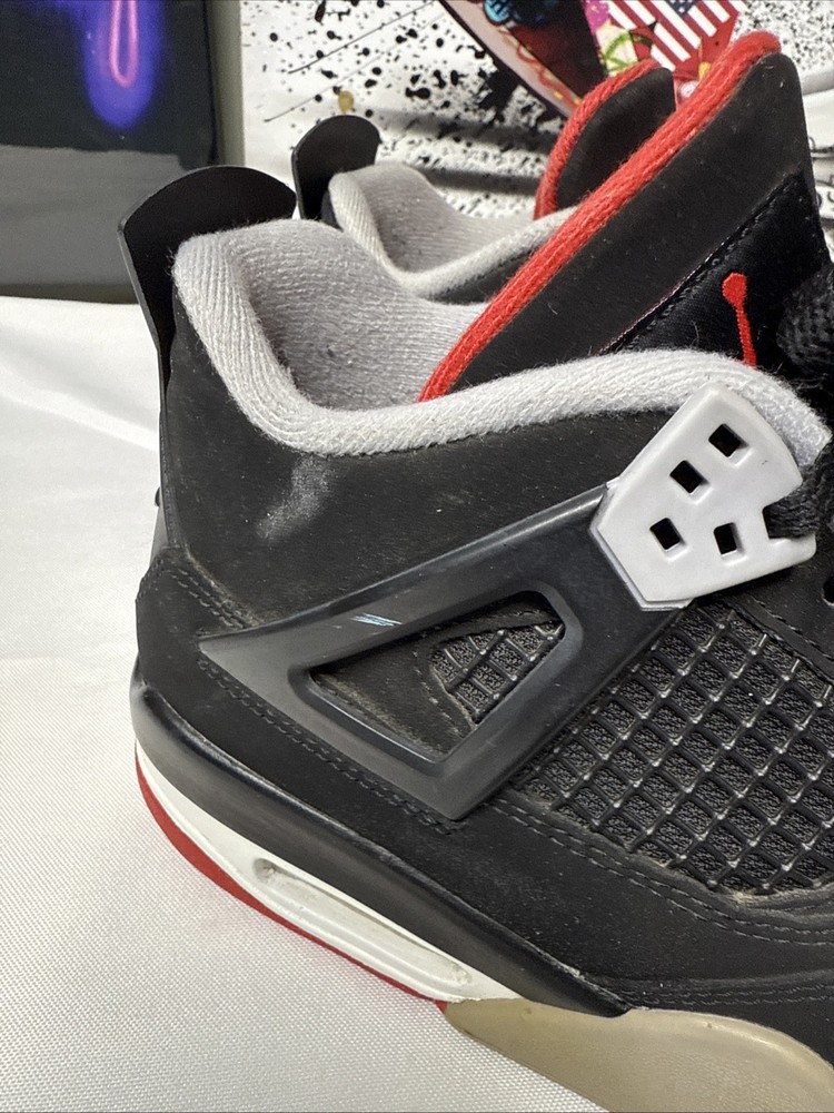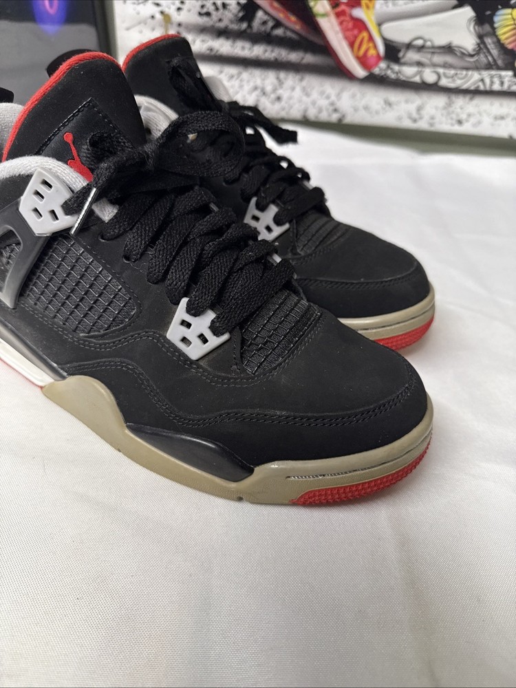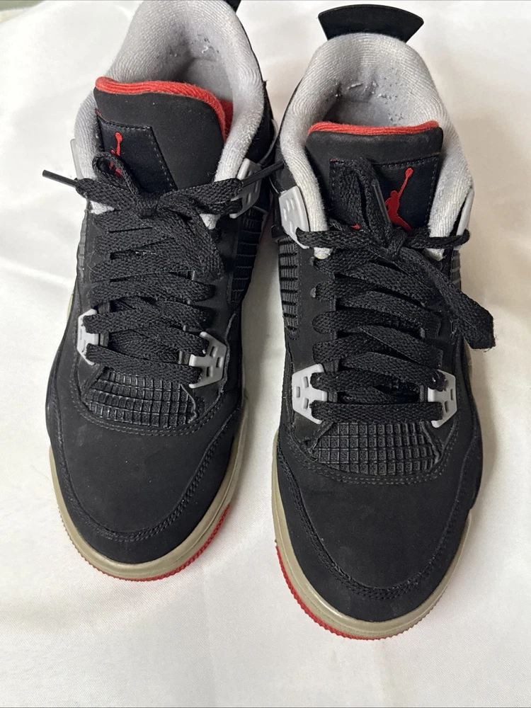 The product is a pair of Jordan 4 Retro Bred sneakers in size 6Y for boys. These athletic shoes are designed with a retro theme in black color, featuring the iconic Jordan brand. While they are used and come without the original box, they still hold value for collectors or fans of the brand. Perfect for active boys who want to rock a classic sneaker style.