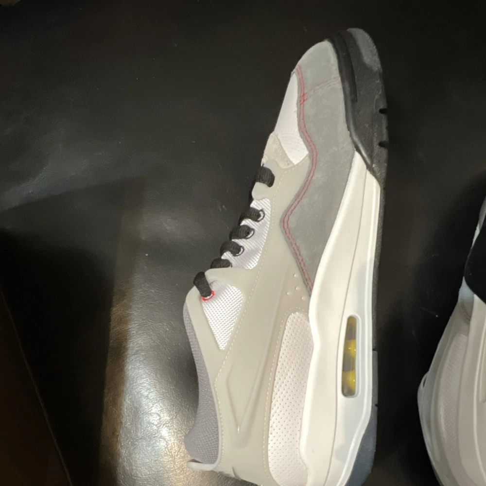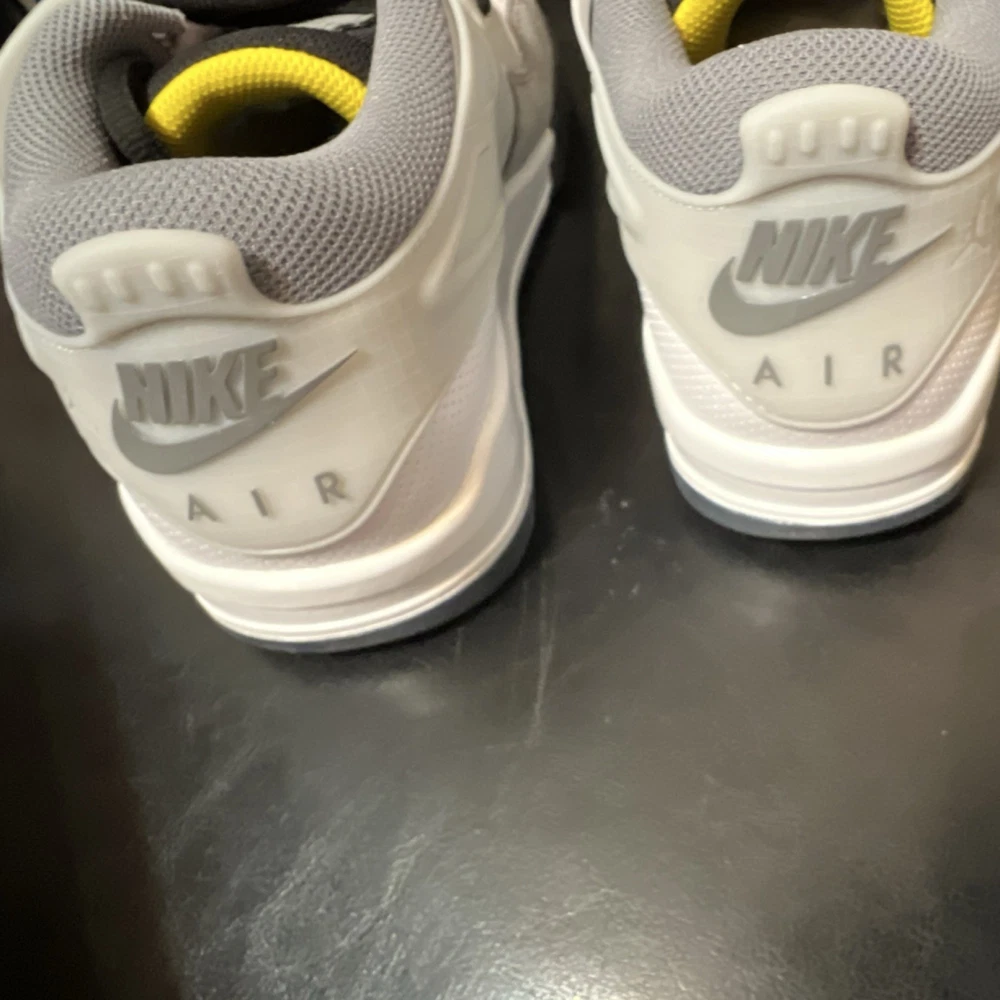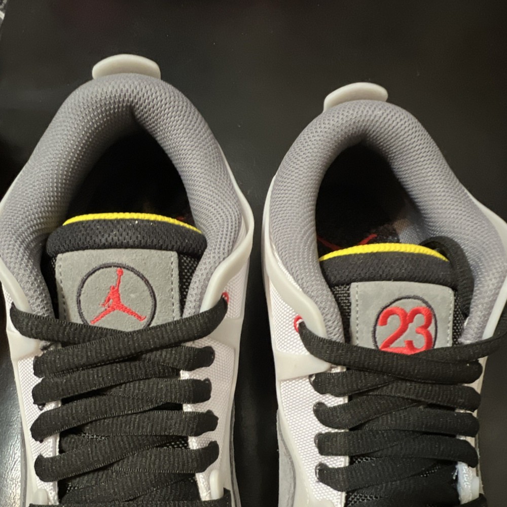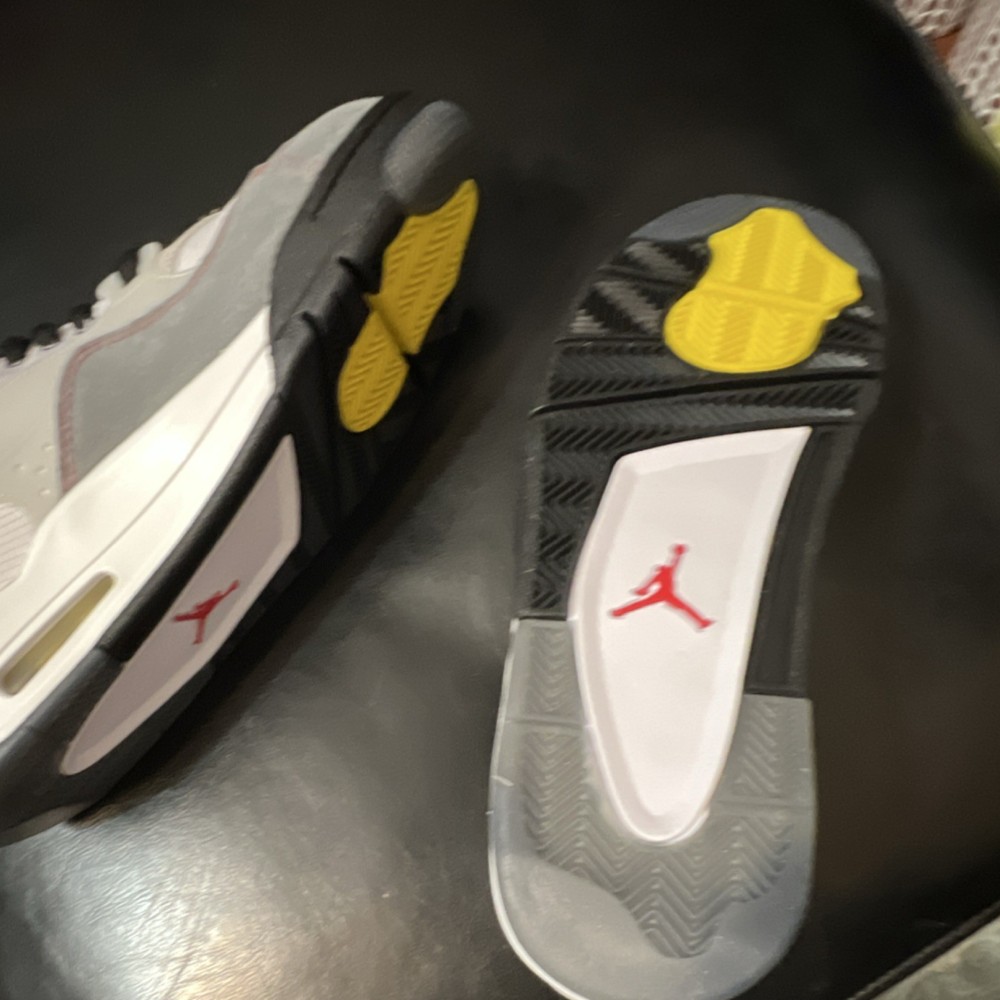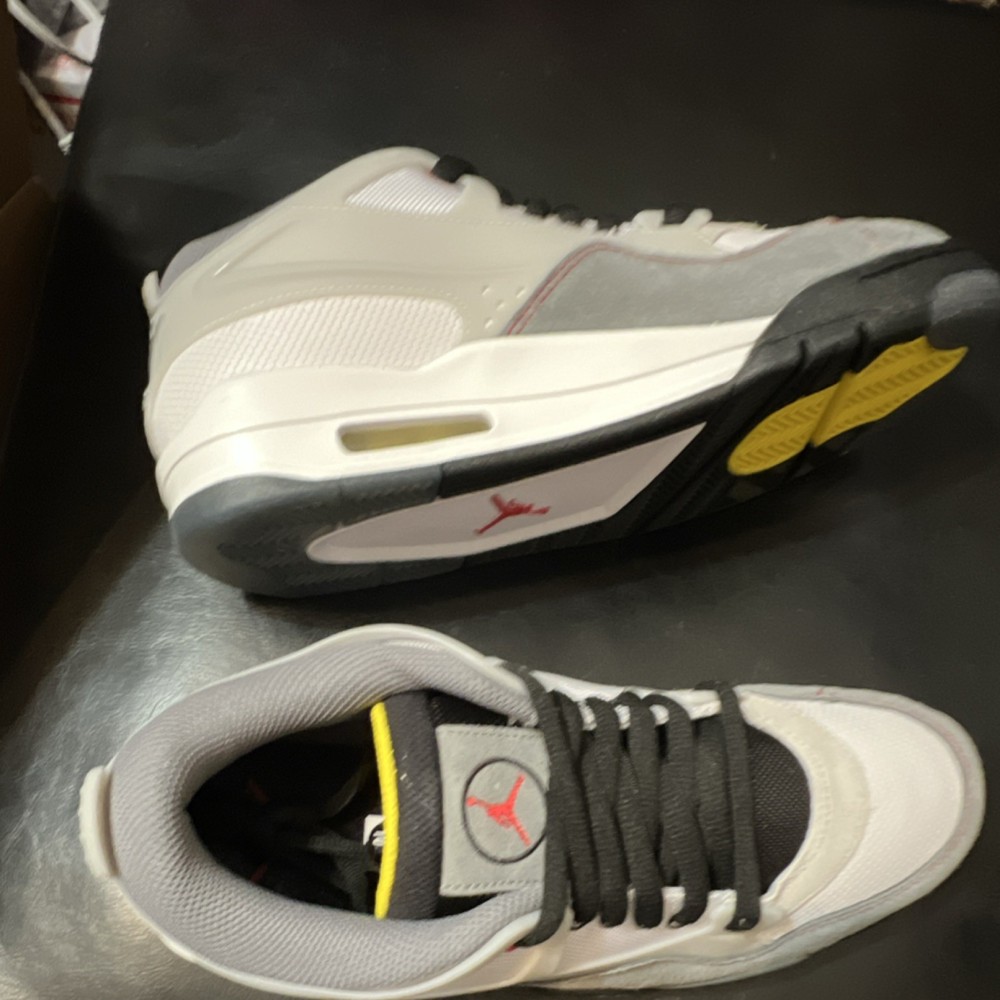 Box without top The product is a pair of Jordan Air Jordan 4 Retro Men's Leather Sneakers in a stylish color combination of Gray, White, Black, Yellow, and Red. These sneakers feature a lace-up closure, rubber outsole, cushioned design, and a low-top silhouette. Perfect for both activewear and casual occasions, these athletic shoes are part of the Air Jordan product line and are designed for basketball performance. The leather upper material, fabric lining, and foam insole ensure comfort and quality, making them a must-have for any sneaker enthusiast looking to elevate their footwear collection.