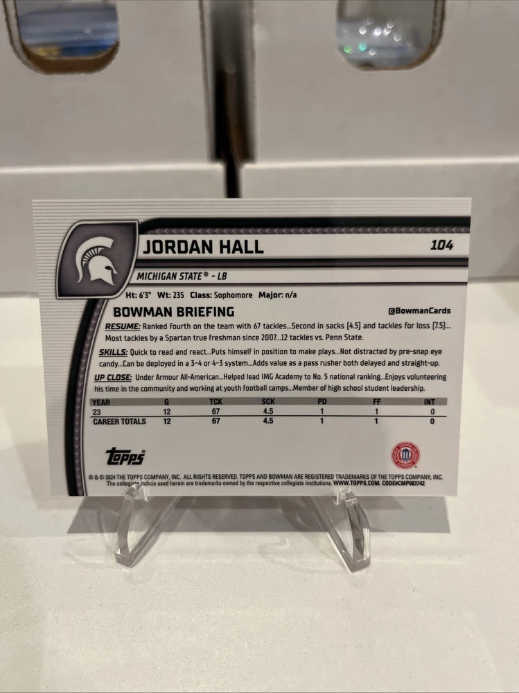 The product is a 2024 Bowman University Chrome Sapphire Orange Shimmer Refractor card featuring Jordan Hall, a player in the National Collegiate Athletic Association (NCAA) football league. This sports trading card is a part of the 2024 Bowman University Chrome set manufactured by Topps. It is a parallel variety card with a limited production, numbered as 1st out of 25, making it a rare find for collectors. The card is designated as a rookie card and is sure to be a sought-after item for fans of sports trading cards.