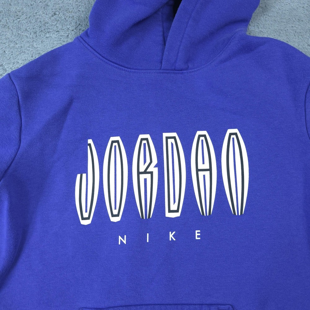 Brand: Jordan Item: Boys pullover hoodie sweatshirt Color: Blue with large white stylized JORDAN text and small NIKE lettering across the front Size on tag: L (Boys 12-13 YRS / 147-158 CM) Fabric: Soft fleece knit designed for warmth and everyday comfort Label details: Black woven Jordan neck label with red Jumpman logo; size L 12-13 YRS (147-158 CM); Made in Vietnam Design features: Pullover style with attached hood, front kangaroo pocket, ribbed sleeve cuffs and hem, and cozy brushed fleece interior Branding: Bold front Jordan Nike graphic on chest and small black Jumpman logo screen print on upper back shoulder Style: Casual sportswear hoodie ideal for basketball fans and everyday athletic-inspired wear Please review all photos to see the color, graphics, and overall style of the hoodie. Item is in gently worn pre-owned condition. Item may contain normal signs of wear, blemishes, discoloration, creases and/or other signs of distress. Photos depict the exact item you will receive including measurements . Please refer to photos for full details prior to purchasing. If need be please measure against a similar clothing item you own. Items are cleaned in accordance with eBay's policies and standards and stored in a smoke free weather controlled environment. Fast USPS Shipping - 30 Day Free Returns - Hats Ship in a Box