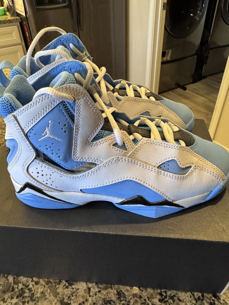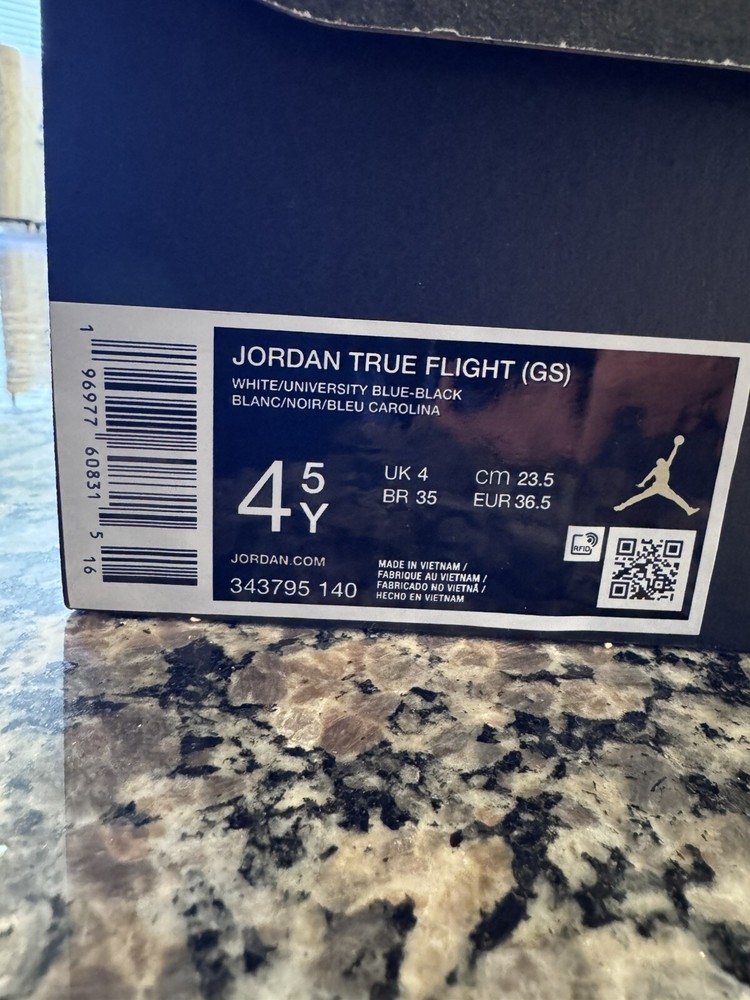 The product is a pair of Jordan True Flight sneakers in University Blue, designed for youth size 4. They feature the iconic Jordan brand and are inspired by university themes.