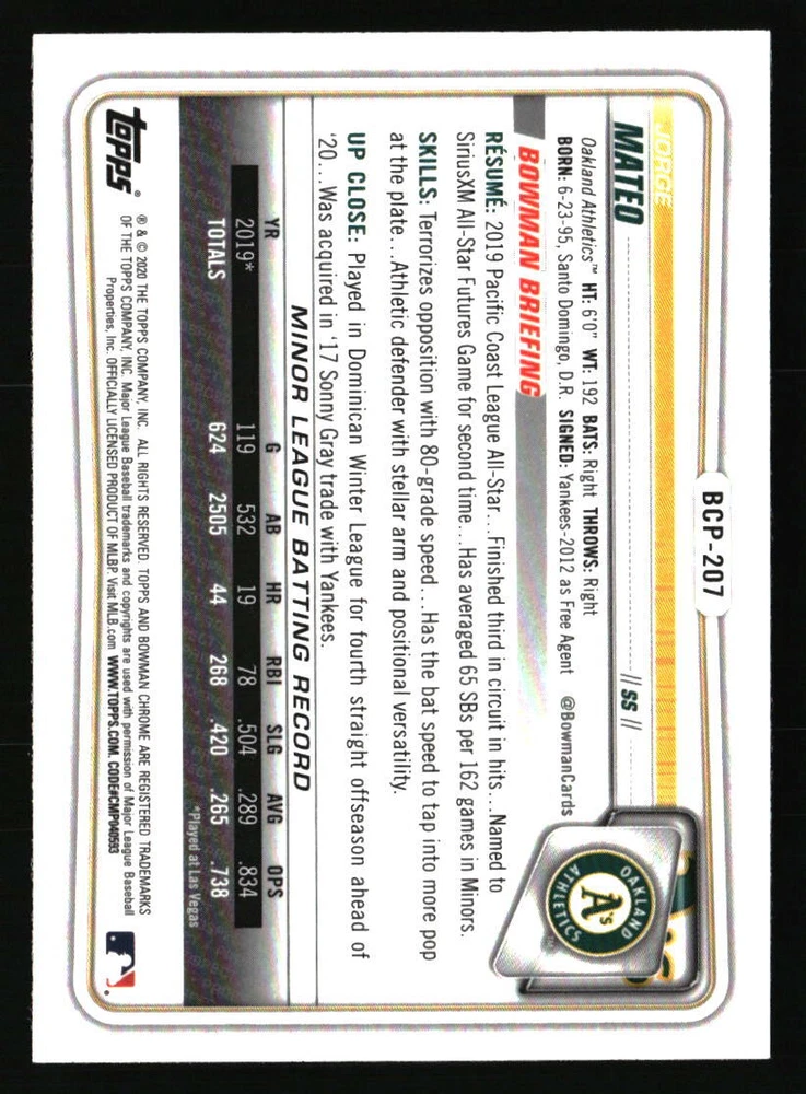 Set: Bowman Chrome Parallel/Variety: Prospects Graded: No Autographed: No Season: 2020 Type: Sports Trading Card Card Number: BCP-207 Sport: Baseball League: MLB Manufacturer: Bowman Chrome Year Manufactured: 2020 Team: Oakland Athletics Player/Athlete: Jorge Mateo
