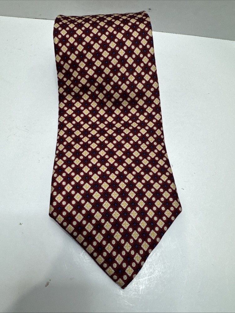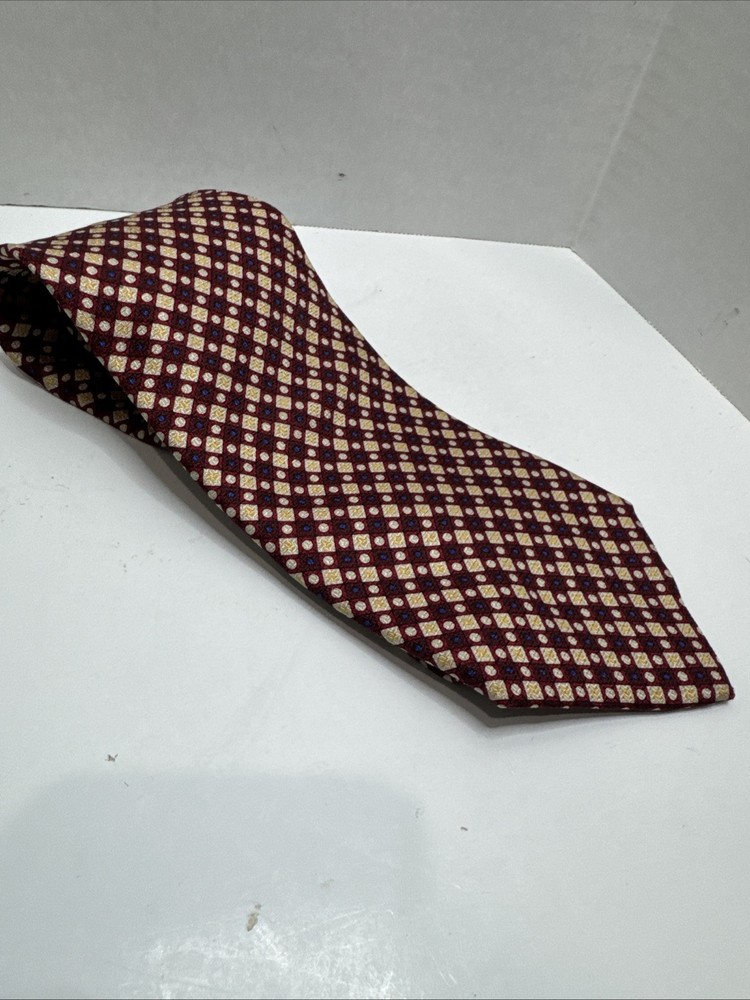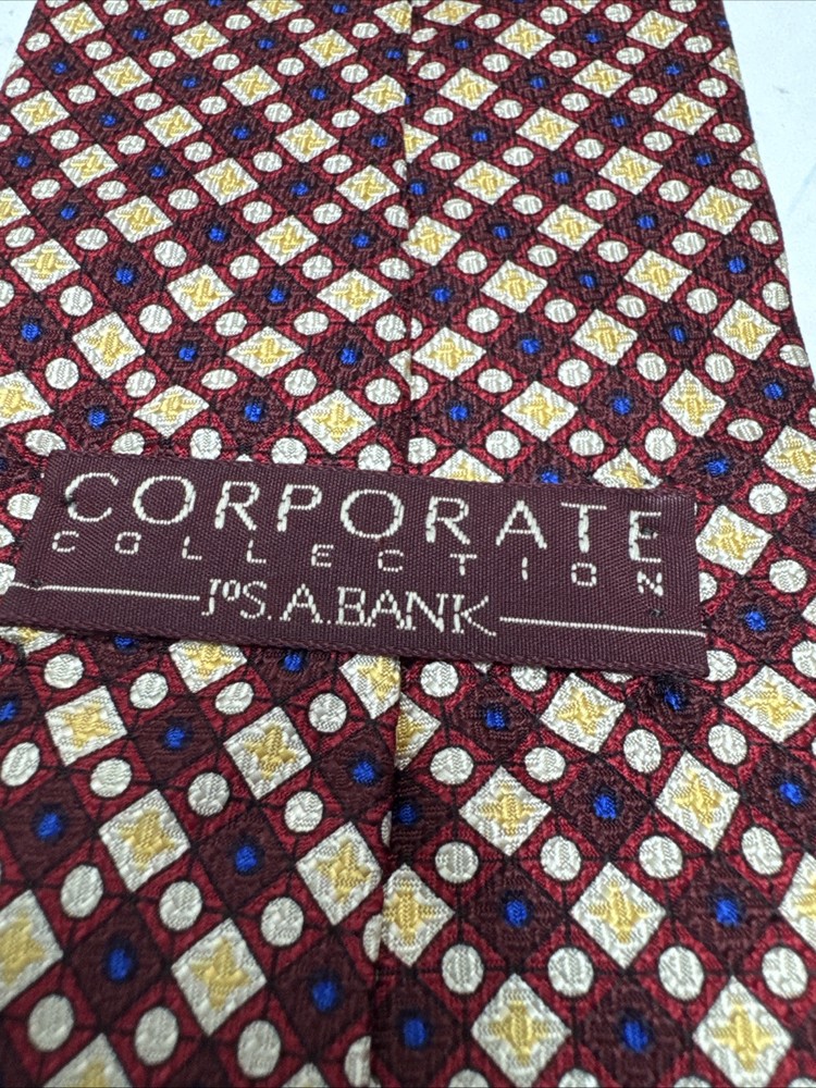 Crafted for the discerning gentleman, this Jos. A. Bank Signature Collection tie is a sartorial staple for any formal occasion. The luxurious silk fabric ensures a smooth, refined finish to your ensemble, while the classic lengths of 57 to 60 inches provide a perfect fit for most. The tie features a striking geometric pattern in red, gold, and blue hues, offering a contemporary twist on traditional business attire. Ideal for weddings, business meetings, or any upscale event, this designer tie exemplifies elegance. The exquisite design and high-quality material reflect the esteemed reputation of Jos. A. Bank, making it an essential addition to any well-dressed man's accessory collection. This item is new without tags, ensuring that you receive a pristine piece straight from the manufacturer. 57”