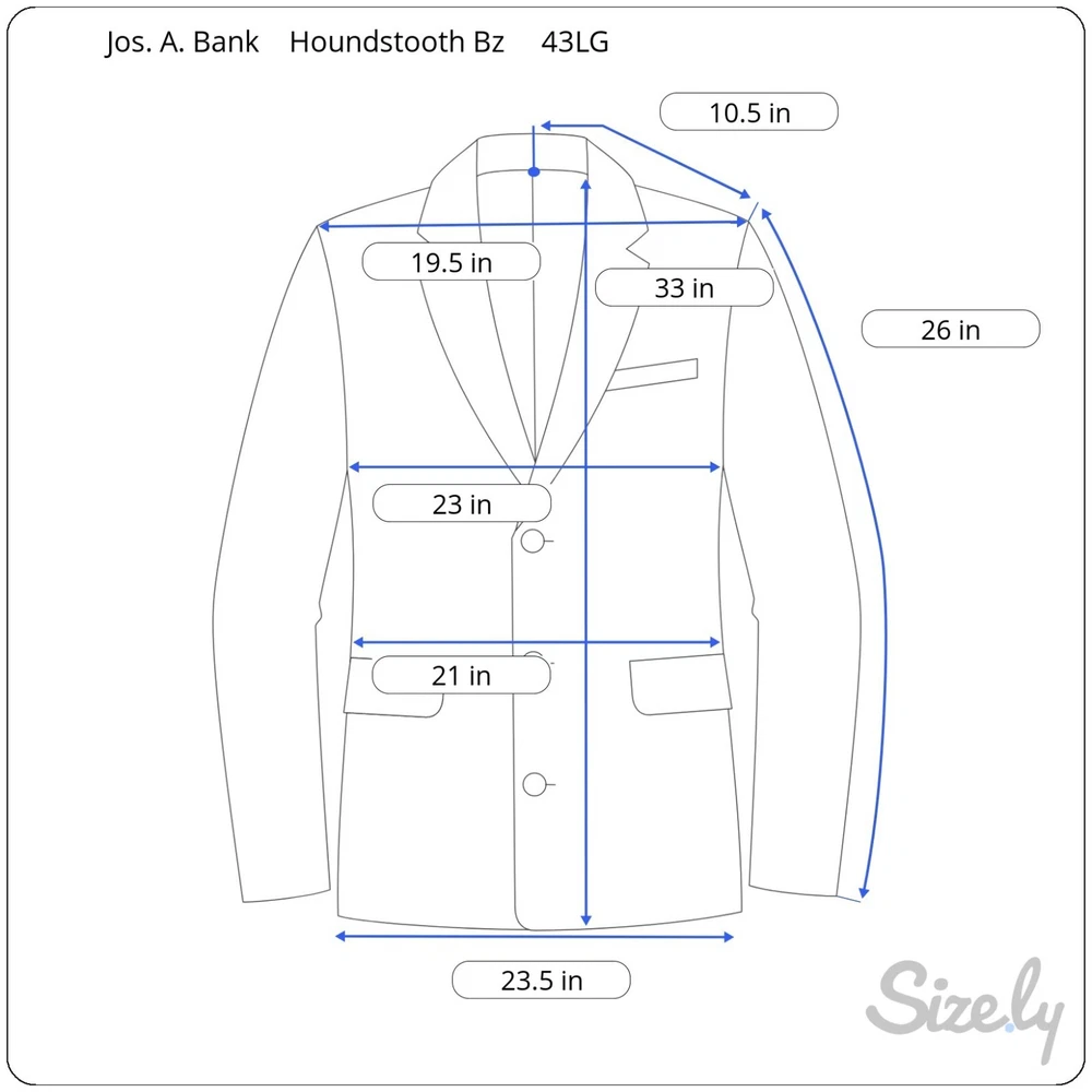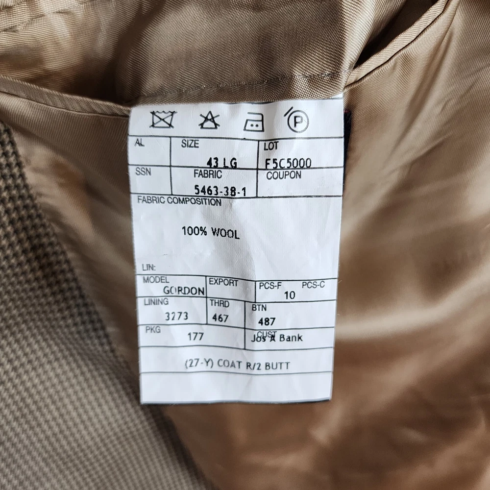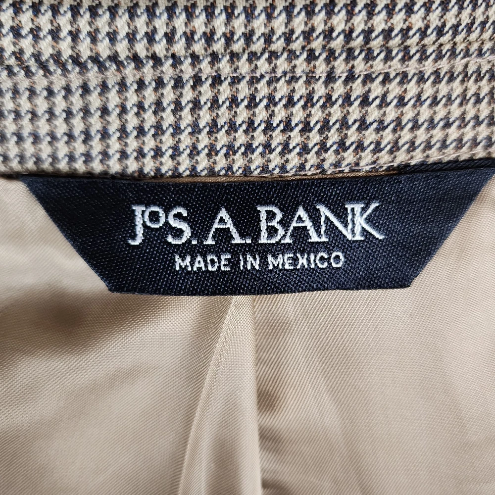 Jos. A. Bank Tan Houndstooth 100% Wool Gordon Blazer Size 43LG Brand : Jos. A. Bank Tag Size : 43LG Style : Gordon Blazer Houndstooth Signature Collection Material : 100% wool Condition details : No rips, stains, or holes Color : Tan and Black Launder: Dry clean Country of Manufacture: Mexico MEASUREMENTS are APPROXIMATE TAKEN IN INCHES with GARMENT LYING FLAT Please see photo