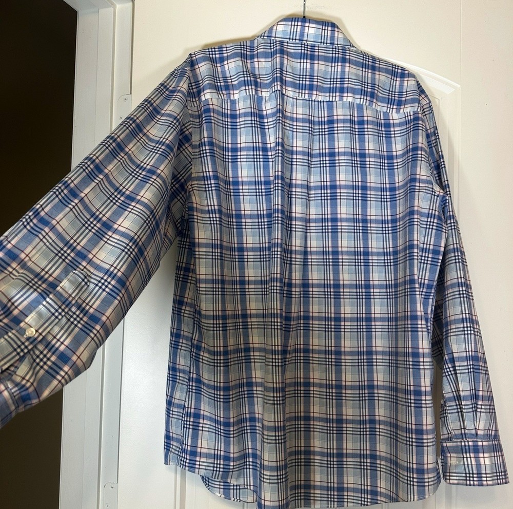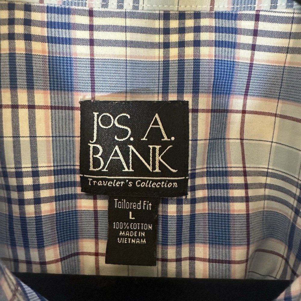 Shirt is in excellent pre-owned condition. No flaws. The Jos. A Bank Traveler's Collection Plaid Button Down Shirt in size L offers a tailored fit for men who appreciate a classic dress shirt. Made from 100% cotton, this shirt features a stylish plaid pattern in a variety of colors, making it suitable for various occasions. With long sleeves and a button closure, this shirt from Jos. A Bank is sure to add a touch of sophistication to any outfit.
