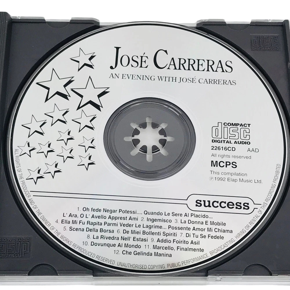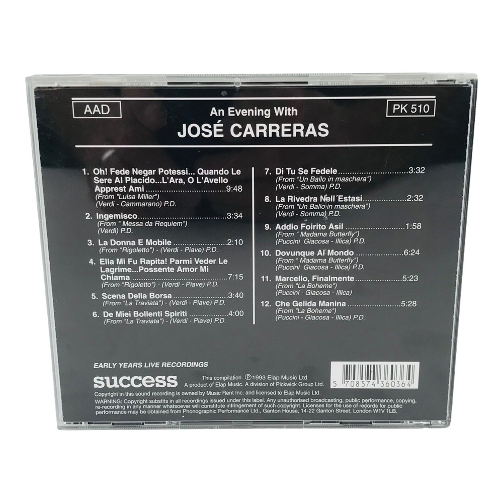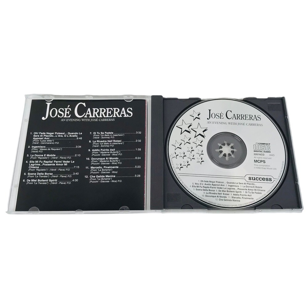 gtin13: 5708574360364 UPC: 5708574360364 Artist: Jose Carreras MPN: 16036CD Edition: Compilation Release Title: An Evening With Jose Carreras Case Type: Jewel Case: Standard Format: CD Release Year: 1992 Era: 1990s Record Label: Success Type: Album Genre: Opera Catalog Number: 16036CD Custom Bundle: No LOC: D2 Style: Opera Color: Multicolor