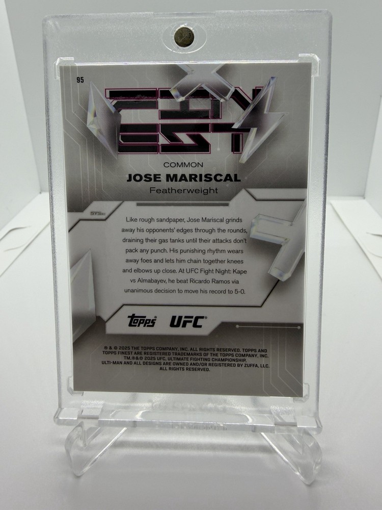 2025 Topps Finest UFC Jose Mariscal Rookie Card Blue Refractor /200. Shipped with USPS. Magnetic holder not included, was used for taking clear photos only. The card will ship to you in a toploader and sleeve. The card has surface imperfections and should not be purchased with the expectation of a gem mint grade if submitted for grading.