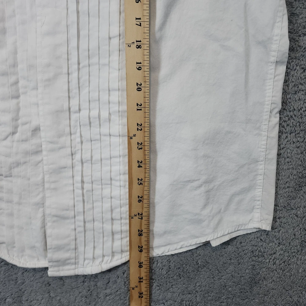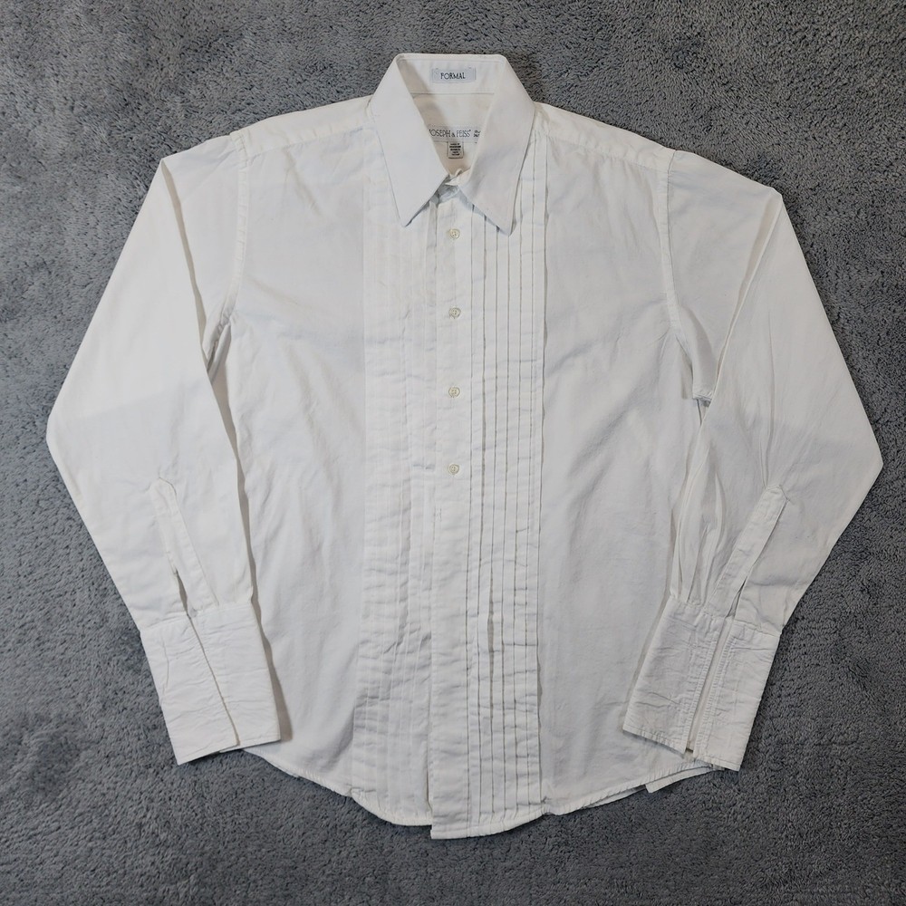 Joseph & Feiss formal tuxedo shirt in a crisp white cotton fabric. This long-sleeve dress shirt features a classic pleated bib front and traditional French cuffs, perfect for black-tie events or formal weddings. The point collar provides a sharp, clean look, while the 100% cotton construction ensures breathability and comfort throughout the evening. Measurements: • Pit to Pit: 23" • Length: 30" Brand: Joseph & Feiss Material: 100% Cotton Style: Tuxedo Shirt Pattern: Solid with Pleated Bib Sleeve Length: Long Sleeve Cuff Style: French Cuff Collar: Point Closure: Button Front Fit: Regular Keywords: Formal, Black Tie, Wedding, Prom, Gala, Classic, Traditional, Pleated Front, French Cuffs, Crisp, Elegant, Sophisticated, Groom, Groomsmen, Evening Wear Excellent condition, gently worn and well cared for. Handling time: Same day or 1 business day USPS Ground Advantage Shipping