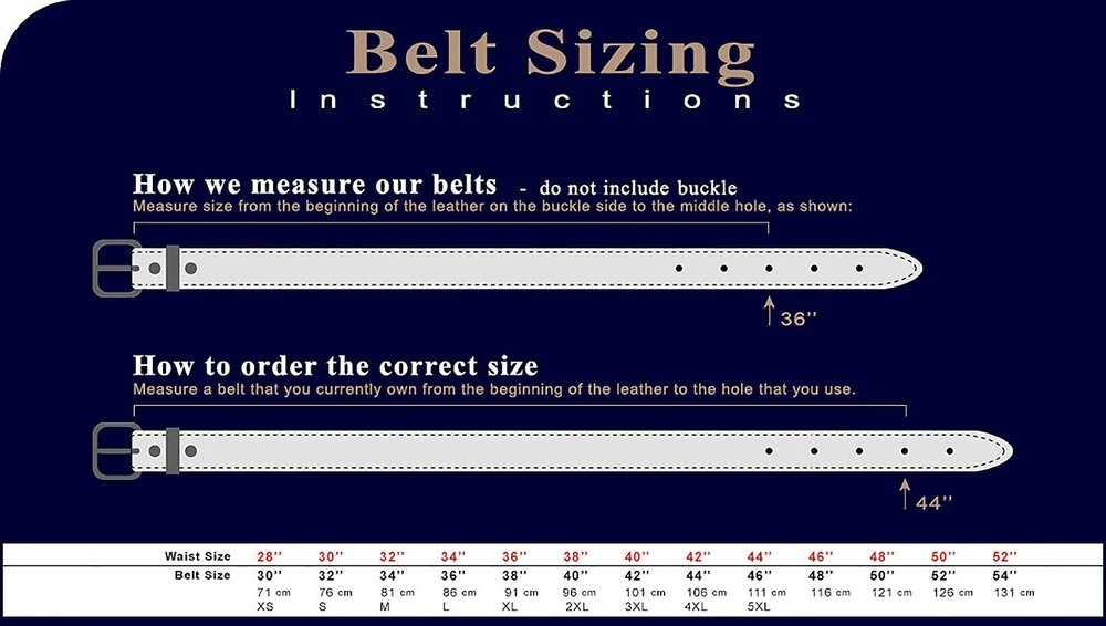 Description 35mm(1 3/8") Wide Solid Brass Antique Brass Finish Buckle. Men's Dress Belts, available in sizes from 32" to 54". 7 Belt Holes at the tip end for size adjustments. Supple Italian Calfskin Leather fully lined with Genuine Leather. Belt is measured from where the leather folds by the buckle to the middle hole at the tip end. Take a measurement of a belt that you currently wear and measure from where the leather folds by the buckle to the hole that fits the best. That number in inches is your belt size. 35mm(1 3/8") Wide Solid Brass Antique Brass Finish Buckle Men's Dress Belts, available in sizes from 32" to 54" 7 Belt Holes at the tip end for size adjustments Supple Italian Calfskin Leather fully lined with Genuine Leather Belt is measured from where the leather folds by the buckle to the middle hole at the tip end. Take a measurement of a belt that you currently wear and measure from where the leather folds by the buckle to the hole that fits the best. That number in inches is your belt size.