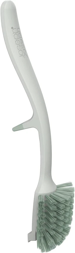 Dish brush with integrated sink rest Non-scratch, curved brush head with integrated pan scraper Excess water drains directly into sink Non-slip resting point grips sink edge Innovative space-saving design This distinctive dish brush helps make full use of space around the sink by conveniently storing inside it. The design has a non-slip resting point that enables it to be stored on the inside edge of the sink, thereby saving space and allowing excess water and soap suds to drain neatly away. The non-scratch brush head is curved to help clean in the corners of trays and pans and has an integrated pan scraper for tough food deposits. Dishwasher safe.