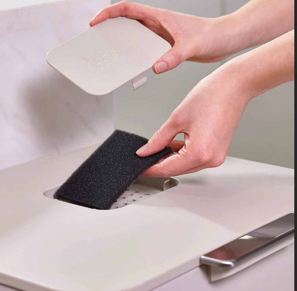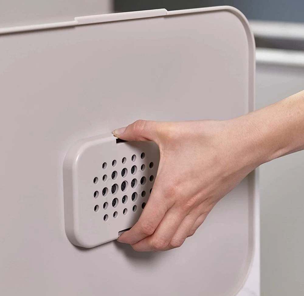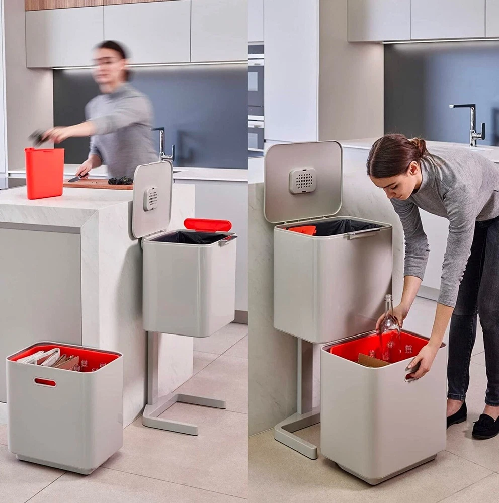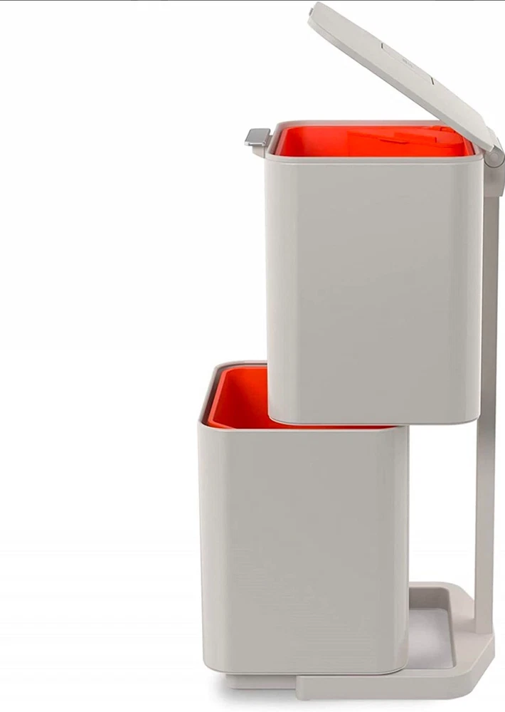 This Joseph Joseph Totem Max Waste & Recycling Bin in is a 60-liter capacity bin with two compartments for waste and recycling. It is square in shape, made of plastic material, and has a contemporary style with a white eggshell finish. The bin measures 18 inches in length, more than 24 inches in height, and 16 inches in width. It is free-standing and suitable for home organization in the kitchen or any household area.