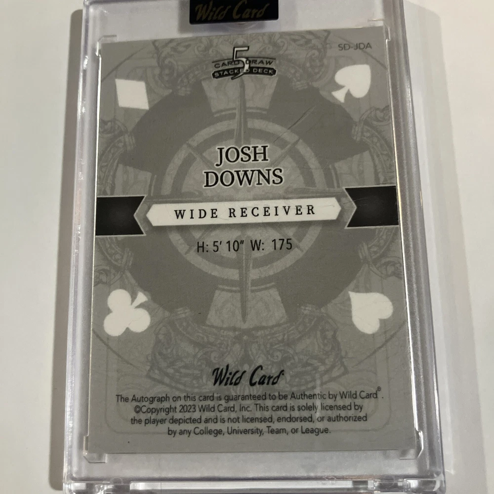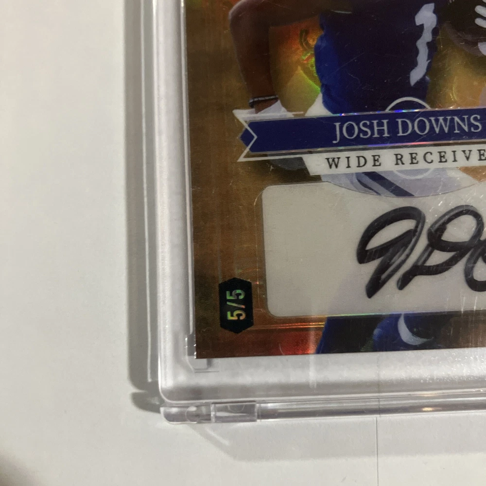 The product is a Josh Downs trading card from the Wild Card set, featuring the Indianapolis Colts wide receiver as a rookie. This specific card is number 5 out of 5 in the set and is in near mint or better condition. The card is not autographed and is categorized under sports trading cards.