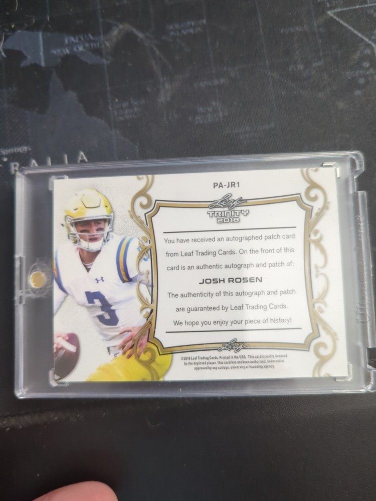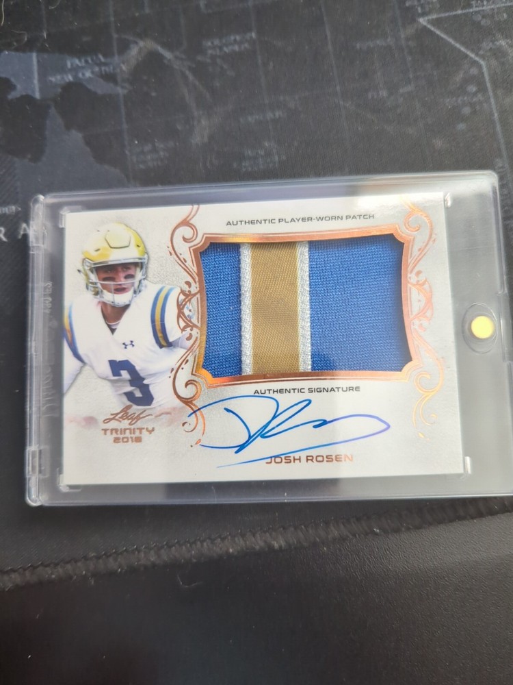 This is a rare and highly sought-after Josh Rosen autographed patch trading card from the 2018 Leaf Trinity football set. The card is in near mint or better condition and has not been graded. It features a patch variation and is perfect for any serious football card collector. The manufacturer, Leaf, is known for its high-quality trading cards and this one is no exception. This card is a great investment for any NFL or UCLA fan or collector.