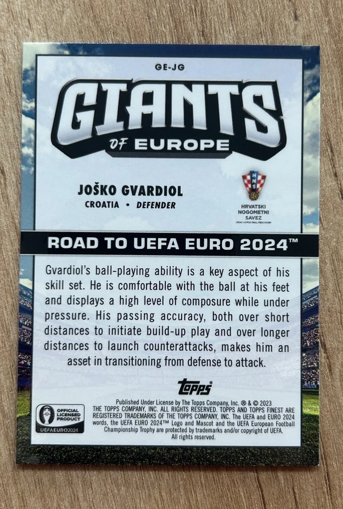 Capture a piece of sports history with the Josko Gvardiol Giants of Europe Topps Finest Road To EURO 2024 GE-JG Case Hit card. This exclusive collector's item features the talented Manchester City and Croatian soccer star, celebrating his impressive performance in the UEFA European Championships. The card, numbered GE-JG, is a must-have for soccer enthusiasts and trading card collectors alike. Produced by Topps, a trusted name in sports memorabilia, it is a tribute to the athlete's skill and a gem for those looking to commemorate the journey to the 2024 European soccer championship.