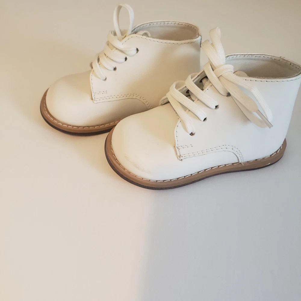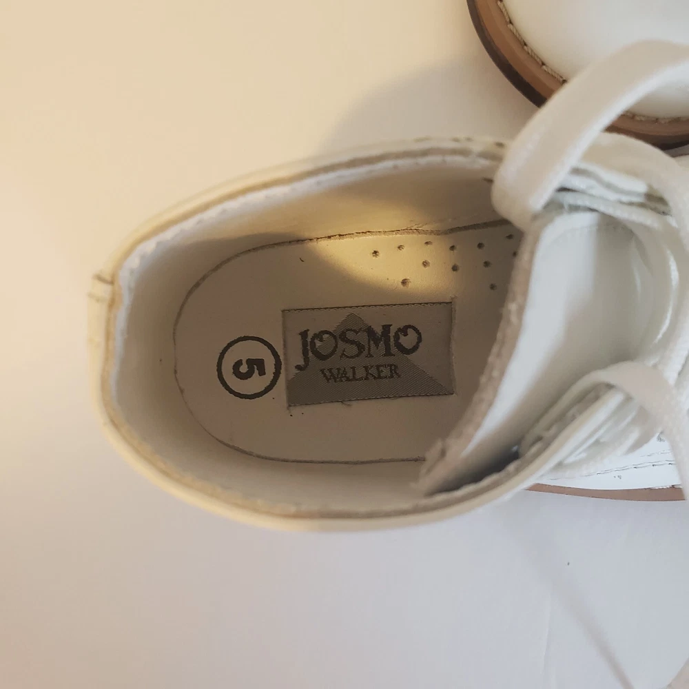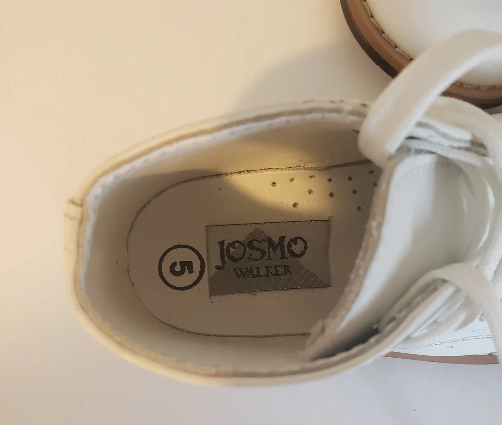 Light scuff on left shoe. Josmo Baby Walker Shoes. Size 5, White, Oxford Very Good Condition. Leather upper, lining, and sole.