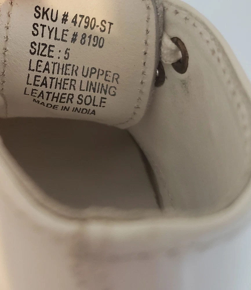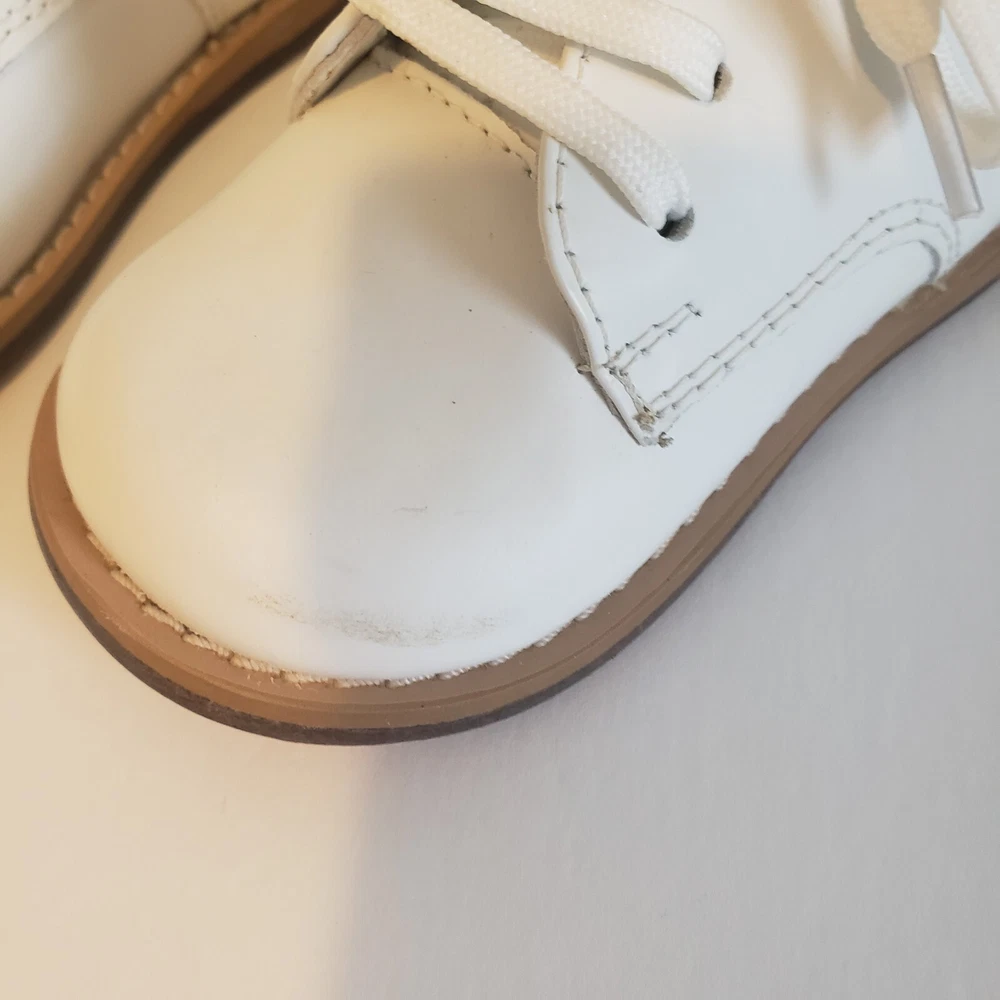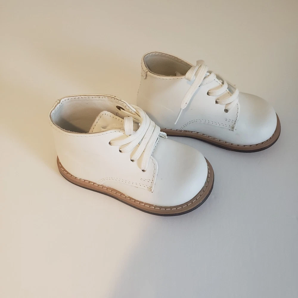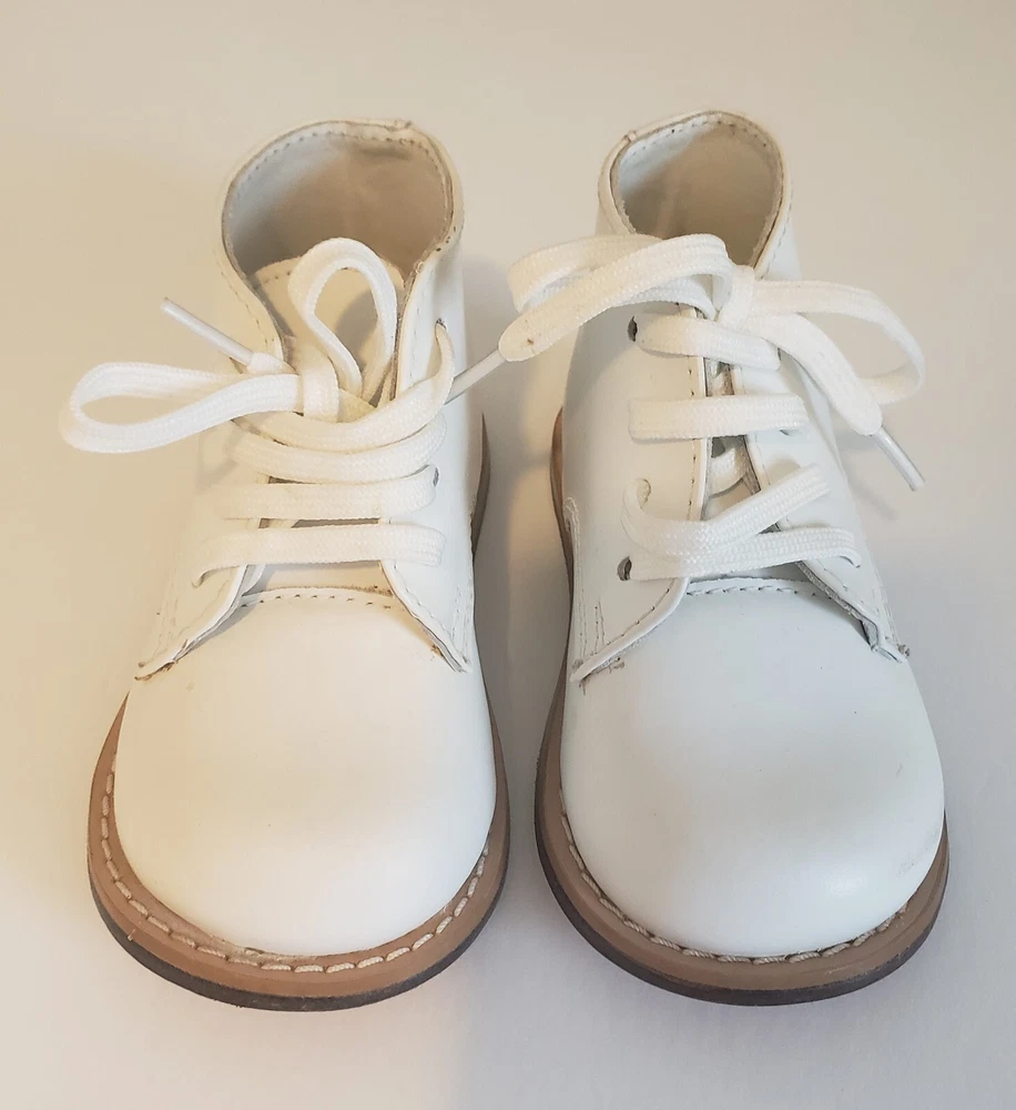 Light scuff on left shoe. Josmo Baby Walker Shoes. Size 5, White, Oxford Very Good Condition. Leather upper, lining, and sole.