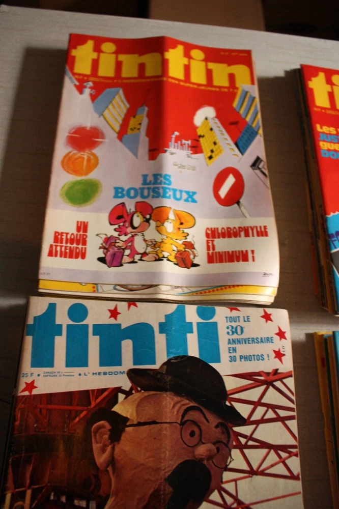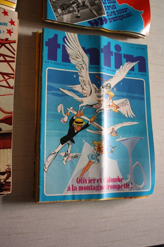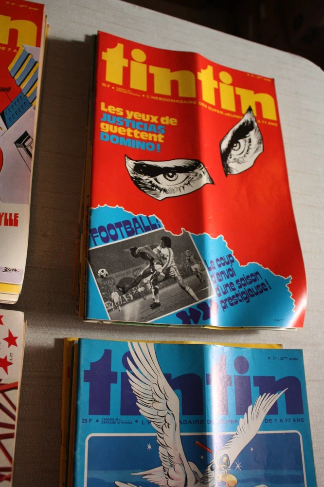 Journal Hebdomadaire Super-Jeunes TINTIN 1977 no. 1-48 +no. 52. No.49 - 51 manquent Journaux en bon état général. Il existe une pliure au centre de certains journaux. Sur certains journeaux, la pliure est plus prononcée La pliure est le résultat de la manière que les journaux étaient pliés pour la poste Evident en photos. Aucune page manquante. Envoi très soigné