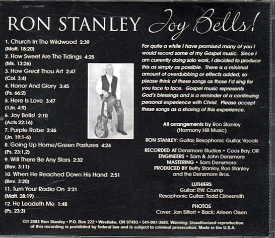 Click Here to add ChainMan Books and Music your Favorite Seller's List # Title/Songwriter Time 1 Church in the Wildwood 2:39 2 How Sweet Are the Tidings 4:25 3 How Great Thou Art 2:47 4 Honor and Glory 3:45 5 Here Is Love 3:47 6 Joy Bells 2:10 7 Purple Robe 2:46 8 Going Up Home / Green Pastures 4:24 9 Will There Be Any Stars 2:32 10 When He Reached Down His Hand 2:51 11 Turn Your Radio On 2:21 12 He Leadeth Me 1:48 To Top Copyright © ChainMan Books and Music 2014 - 202\3 Buy more - save more 10% off 2, 20% off 3, 30% off 4 or more on all items. Save 50% when you buy 5 or more Christian items.