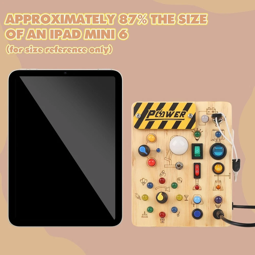 Joyreal Montessori Busy Board Wooden Sensory Toys for Toddler with LED Light Up Switch, Baby Fidget Board Travel Toys for 18+ Months, 1 2 3 Year Old Boys Girls Toddler Toy Gifts (Classic) Product Details Product Dimensions: 5.91 x 3.15 x 0.98 inches Item Weight: 10.8 ounces Country of Origin: China Item model number: 1 Manufacturer recommended age: 18 months - 8 years Batteries: 2 AAA batteries required. Manufacturer: Joyreal [ Montessori Busy Board for Toddlers ] Our busy board is placed different complexity switches, which include light bulbs that match the light of the switch. There are 10 different switches and 19 LED light bulbs set on this busy board. This sensory board will help your children enjoy hours of entertainment. Requires 2 AAA batteries (batteries not included). [ Educational Learning Toys ] This wooden busy board increases your child's dexterity, eye and hand coordination for fine motor skills and pure fun. It's a great montessori toys for toddlers, and a learning and educational toy instead of screen time. [ Portable Travel toys ] This busy board is a suitable size and easy to carry, perfect for traveling by car or plane. This sensory board will keep your kids busy on long trips and will not make any noise, allowing both parents and baby to enjoy the trip. [ High Quality Sensory Toys ] Our toddler fidget toys is made of eco-wood, smooth product edges and all the various buttons, switches, and shifters are solidly installed. The busy board is high quality and very sturdy. You don't have to worry about your baby breaking it and it is very safe for your child. Soft light will not hurt the eyes of children. [ Perfect Toy Gifts for Kids ] This is a great fun montessori toys for toddlers to press easily and is the perfect birthday and Christmas gift. You can play with your kids and teach them colors and sizes. Tips: Please check product dimensions before placing your order,Thank you!