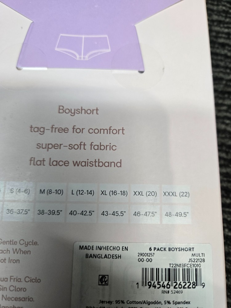 This Joyspun 6-Pair Women's Boyshorts Underwear Panties are made of a comfortable Cotton Blend material with a lace waist detail. They are size 2XL (20) and come in a multicolor pack with various patterns. These mid-rise panties feature a tagless design for added comfort and are machine washable for easy care. Perfect for everyday wear, these opaque boyshorts offer a flattering fit and are a stylish addition to any woman's intimates collection.