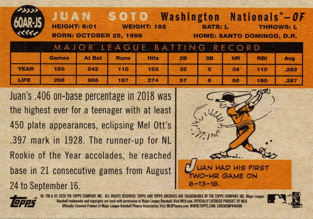 Juan Soto 1960 All-Star Rookies rookie card from the 2020 Topps Archives set features a standard-sized MLB trading card of the Washington Nationals player. The card is made of card stock and is an original insert, not a vintage reprint. It is in English and showcases Soto as part of the 1960 All-Star Rookies insert set, with card number #60AR-JS.