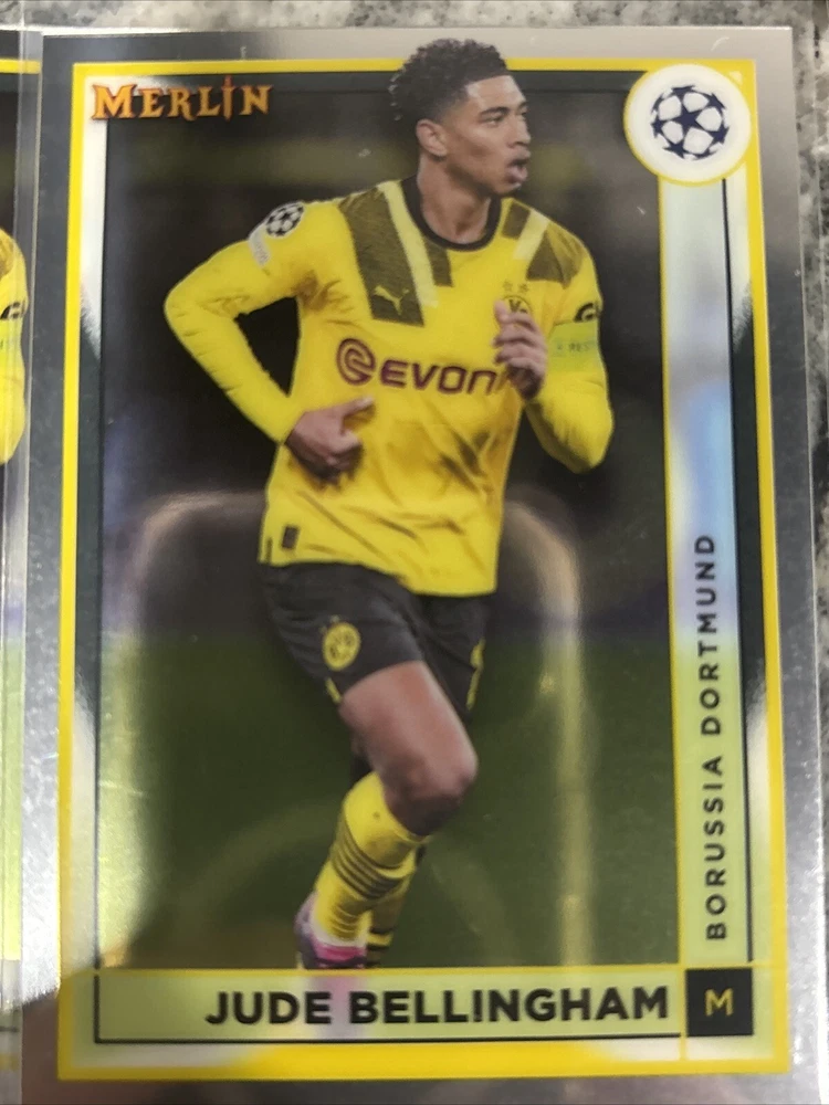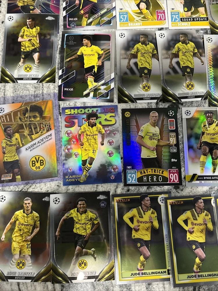 This lot of 25 sports trading cards features players from Borussia Dortmund, including Giovanni Reyna, Jude Bellingham, and Erling Haaland. The cards are from the 2023 Topps Stadium Club Chrome, Match Attax, and 2023 Topps Merlin sets, and were manufactured by Merlin in 2024. Fans of soccer and the UEFA Champions League will love this collection, which includes cards from the 2021-22 season. Whether you're a collector or a fan of Dortmund, this lot is a must-have. These trading cards are a great addition to any collection, and feature some of the most exciting players in soccer. Don't miss out on the chance to own these cards from the 2023 Topps Stadium Club Chrome, Match Attax, and 2023 Topps Merlin sets. Adeymi Stadium Club Chrome Goal Force 18/25.