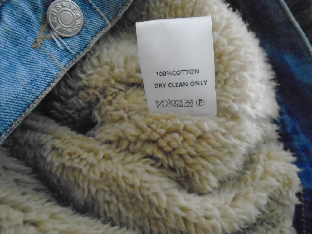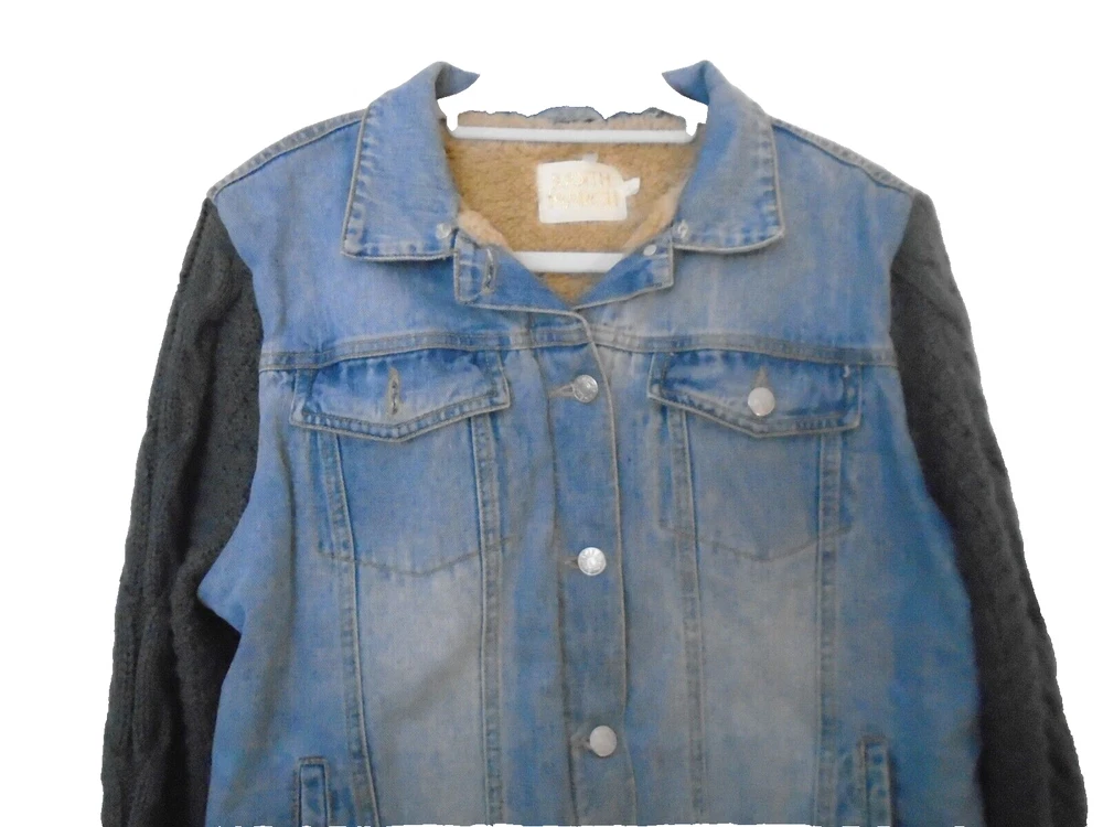 This stylish women's jacket from Judith Marsh is perfect for any occasion. The outer shell is made of 100% cotton denim and grey cable sweater sleeves, making it a colorful addition to your wardrobe. The jacket features a button closure, long sleeves, and pockets for added functionality. Faux fleece lying for warmth It is available in size Large and is suitable for winter, fall, and spring seasons. This basic jacket is perfect for travel, party/,and casual, occasions. It's machine washable and easy to care for. Judith Marsh Vintage Womens Sz L Jean Jacket Fleece Lined and Sweater Sleeves Actual Measurements lying flat Back of neck to hem 25" Bustline pit to pit 20" so approx 40" measurements from the outside 31/sav15