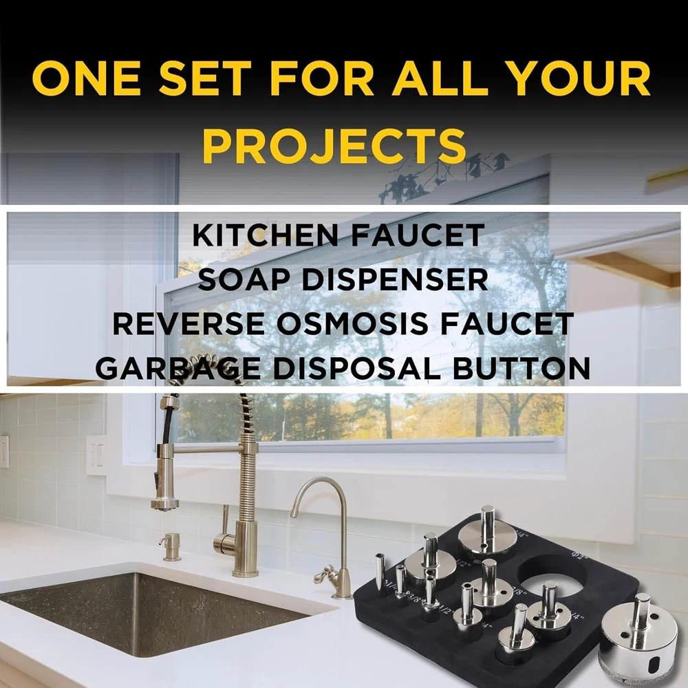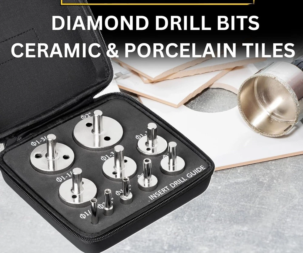 Juego de 10 brocas de diamante para sierra perforadora: brocas de diamante de alta calidad recubiertas de diamante; tamaños 1/4, 3/8, 1/2, 3/4, 1, 1-1/4, 1-3/8, 1-1/2, 1-3/4 y 2 pulgadas; también se incluye una guía de brocas de diamante Solución ideal para trabajar con azulejos: el kit de 10 brocas de diamante para azulejos hace cortes circulares perfectos; nuestro juego de brocas de diamante para azulejos es un gran reemplazo para un cortador de azulejos Brocas de diamante para macetas de cerámica: crea tu propia maceta; nuestro juego de brocas de cerámica te ayuda a hacer agujeros de drenaje para tus plantas; el juego de 10 brocas de diamante para sierra perforadora tiene el tamaño adecuado para cualquier maceta Brocas de diamante para vidrio: nuestro exclusivo juego de brocas de diamante para sierra perforadora te ayuda a hacer agujeros perfectos en vidrio; ya sea como broca para vidrio para botellas o para un proyecto de pecera; incluye un juego completo de brocas para vidrio con revestimiento de diamante duradero Juego de 10 brocas para baldosas de cerámica: juego completo con estuche con cremallera y guía de brocas; incluye 10 tamaños de brocas para baldosas de cerámica; este juego de sierras perforadoras para baldosas de cerámica es esencial para cualquier proyecto de baldosas Brocas para baldosas de porcelana de acero de aleación sólida: nuestro kit de sierra perforadora para baldosas con brocas de diamante para trabajos con baldosas de porcelana brinda resultados perfectos; las brocas para baldosas con triple revestimiento de diamante son fáciles de usar y mantener Brocas de diamante para piedra: brocas de granito fáciles de usar con la guía de sierra perforadora de diamante incluida; perforar agujeros en encimeras de granito es casi demasiado fácil; nuestro kit de sierra perforadora para granito atraviesa cuarzo, mármol o granito