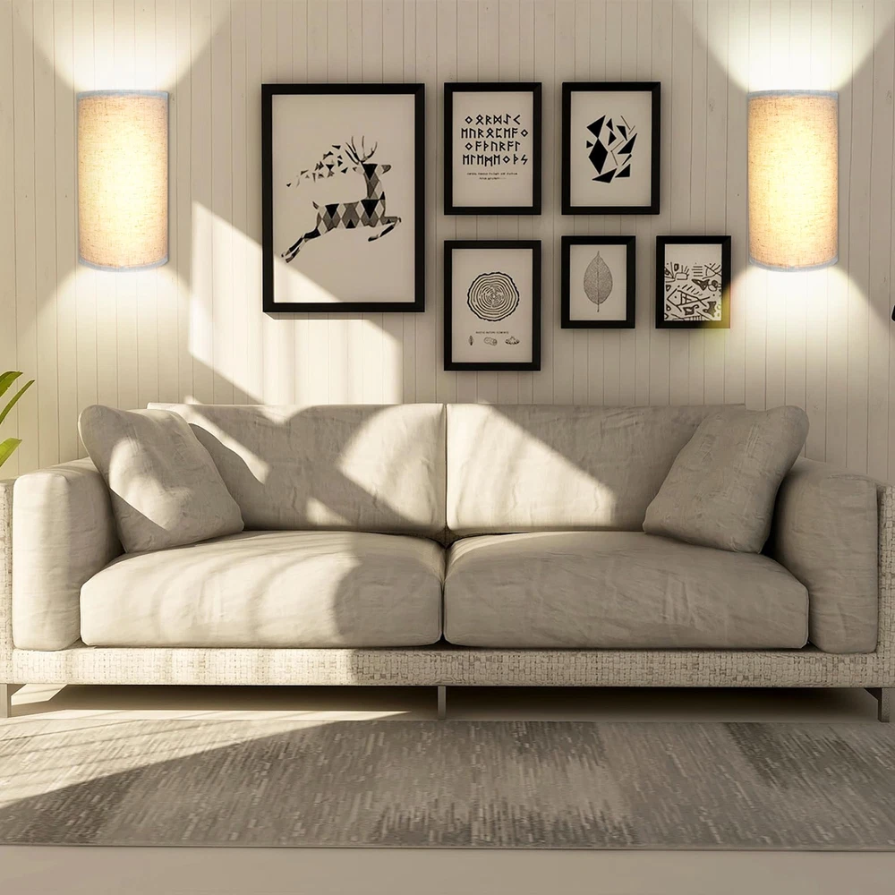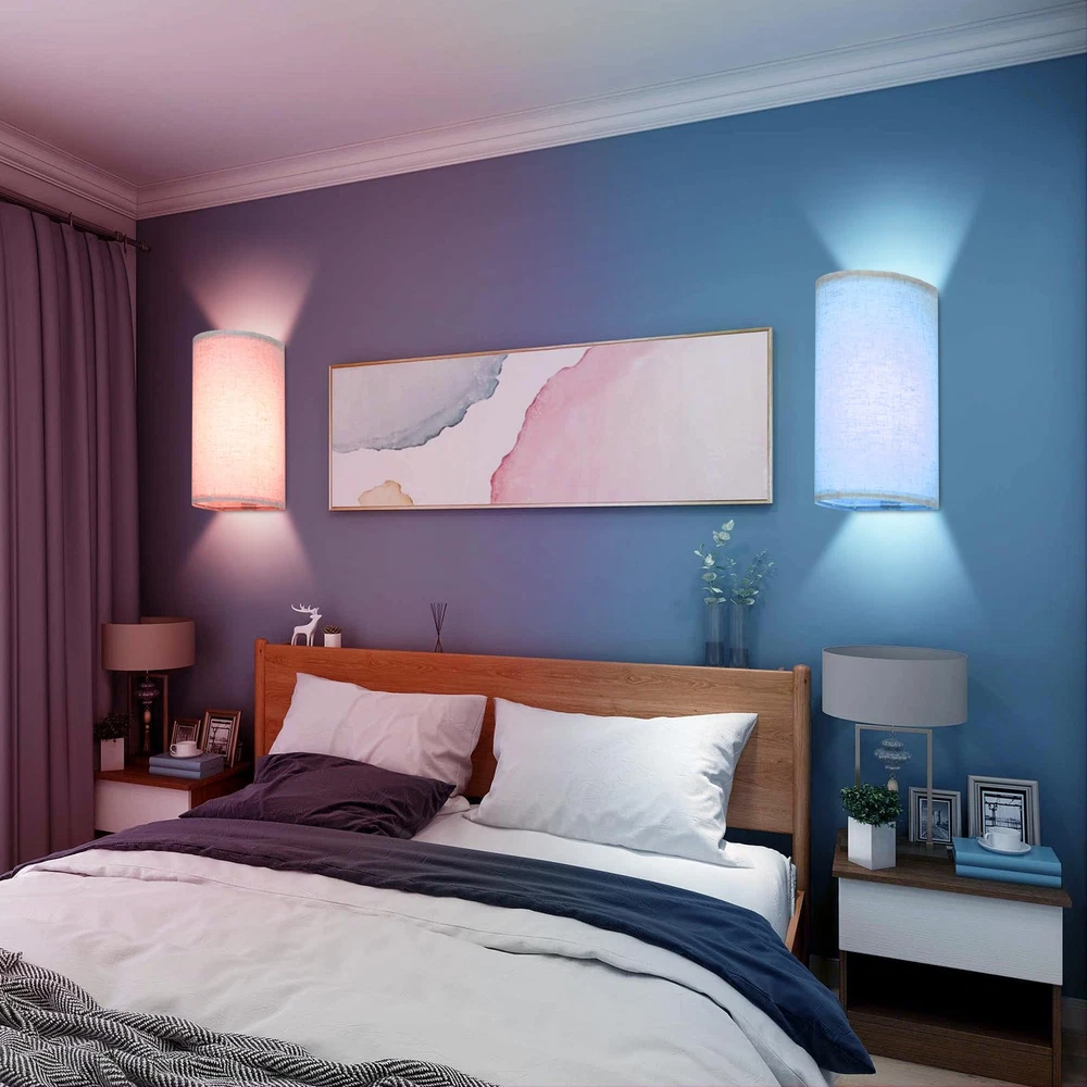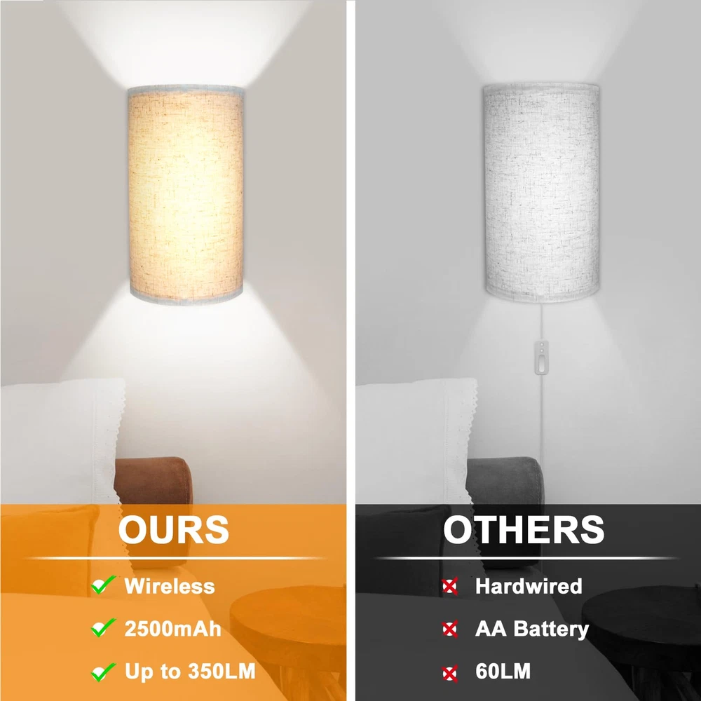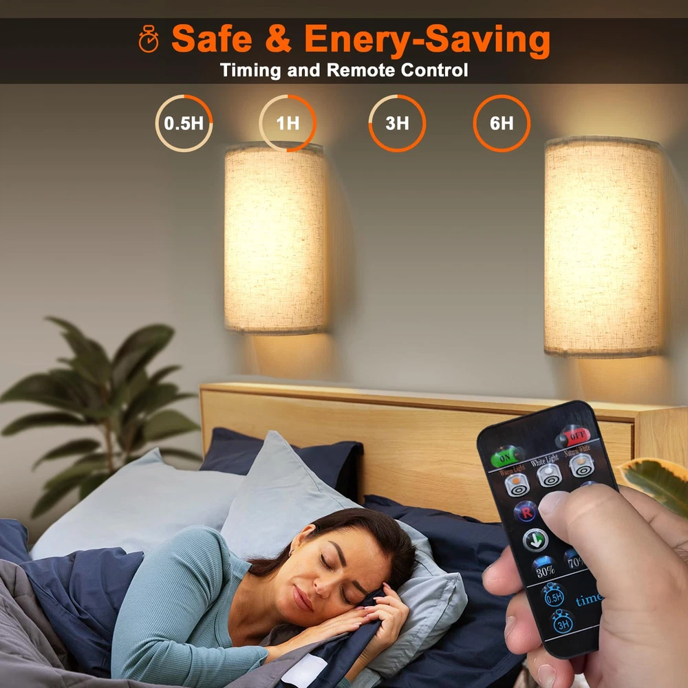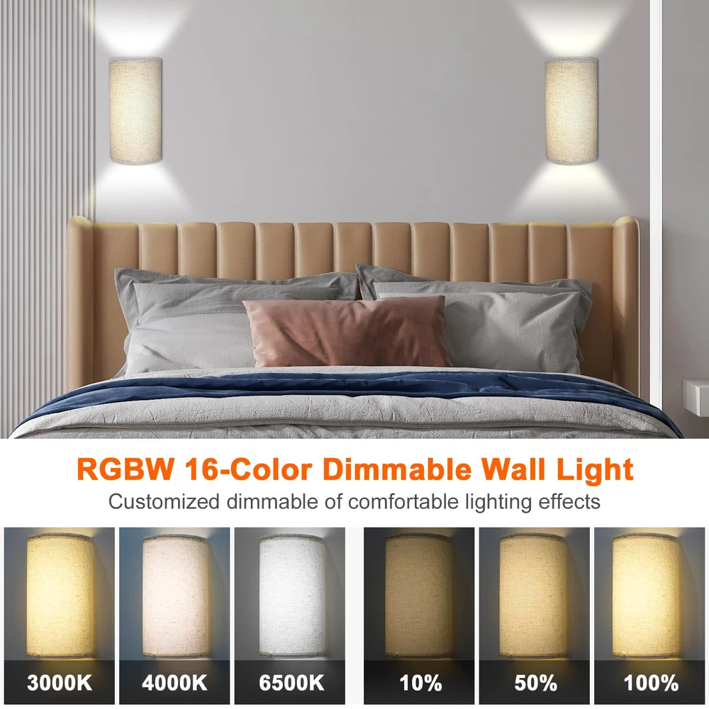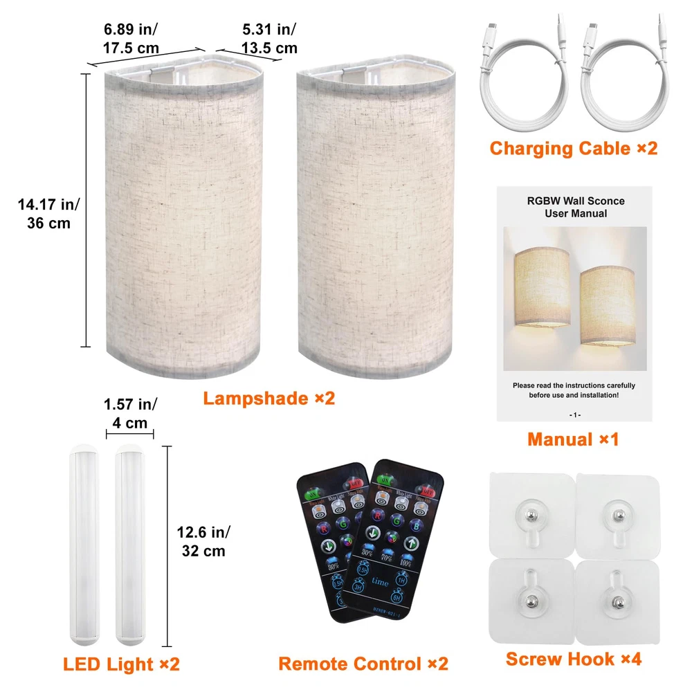 Battery Rechargeable Wall Sconce Materlal: iron/canvas Installation Method: magnetic suction Lumen: 150 -350lm Color Temperature: 3000K + 4000K + 6500k Input: 5V 2A Battery Life: over 20 H Charging Time: 2-3 hours (In charging: red light, Fully Charged: green light) Remote Control Battery: CR2025 Remote Control Range: 3-5M, 30° Package List: Strip Light *2 Canvas *2 Stand *2 Remote Control *2 Charging Cable *2 Screw Package *4 Manual *1 Simple Vintage Fabric Design: This rechargeable wall sconce is made from high quality linen craftsmanship, the unique fabric shade shines through a soft and non-glare light, simple and unique design suitable for most modern interiors. Rechargeable Battery Timer Wall Light: Built-in 4400mAh high-capacity battery, fully charged in 3-4 hours, can illuminate for 30 hours at the highest brightness. Remote control can set 0.5/1/3/6 hours auto off timer, perfect for bedside night light. High Brightness & Dimmable: Long LED multi-bead design wall light, the brightness can reach 150-350 lumens, which is 2-3 times brighter than other battery lights, you can adjust the brightness from 10%-100% using the remote control and touch. 3 Color Temperatures And & Colors: manual touch can adjust three color temperatures, RGB lights and brightness, remote control can adjust 16 RGB colors and 3 color temperatures to provide ambiance in resting, studying and entertaining scenes. Magnetic Connection: Our modern wall sconce without wires comes with wall sconces with strong magnets that attach vertically to the mounting plate, easy to install, no shadows, and convenient to charge at any time. Commonly used in bedroom, dining room, living room, hallway, also can be used as porch light.