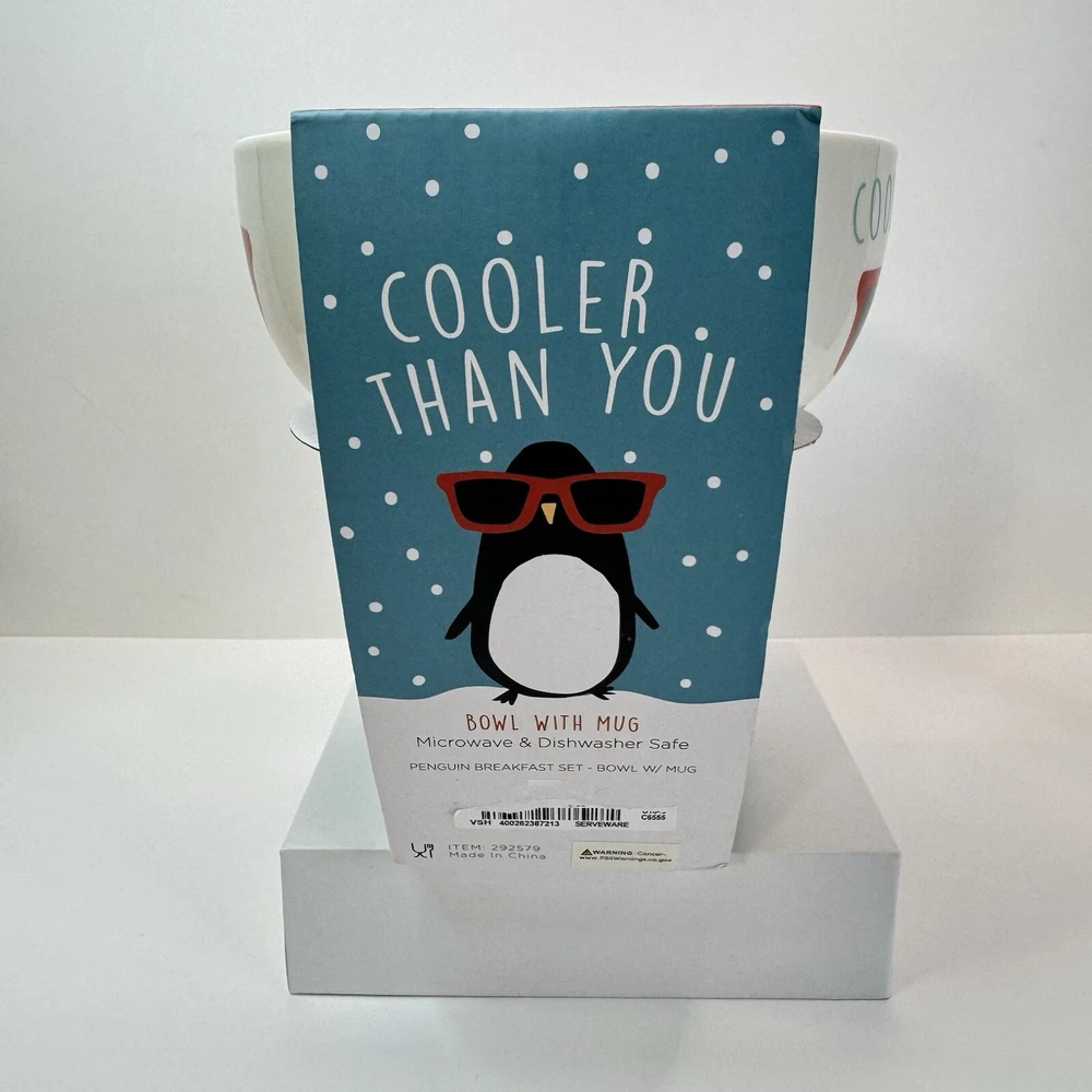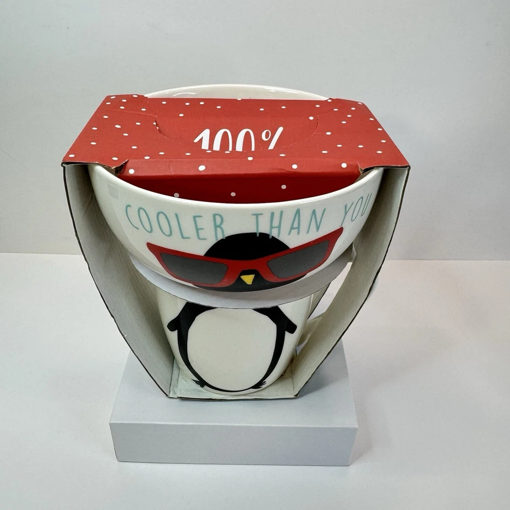 The Penguin Mug and Bowl Matching Set is a charming addition to your kitchen, featuring a white coffee mug and bowl with a playful "Cooler Than You" design. The set includes a matching mug, perfect for enjoying your favorite hot beverages in style. This set is a great gift idea for anyone who loves penguins or enjoys a touch of whimsy in their kitchen decor.