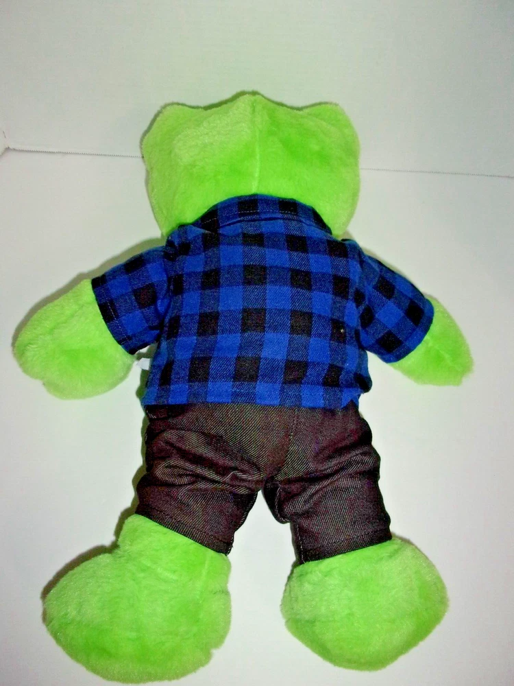 Build A Bear Green Frog Plush Toy Dressed in plaid shirt & Jeans approx 17" high