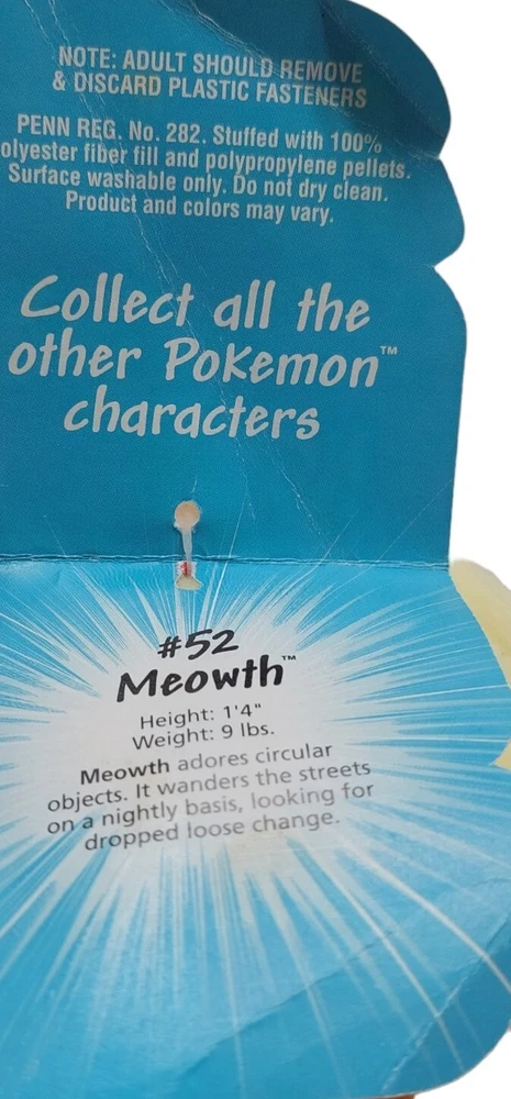 Animal:meowthEstado del artículo:UsadoAge Level:3-4 YearsCharacter Family:PokemonBrand:HasbroRecommended Age Range:3+Color:Yellowgtin13:Does not applyYear:1998UPC:Does not applySize:Small (6-14 in)