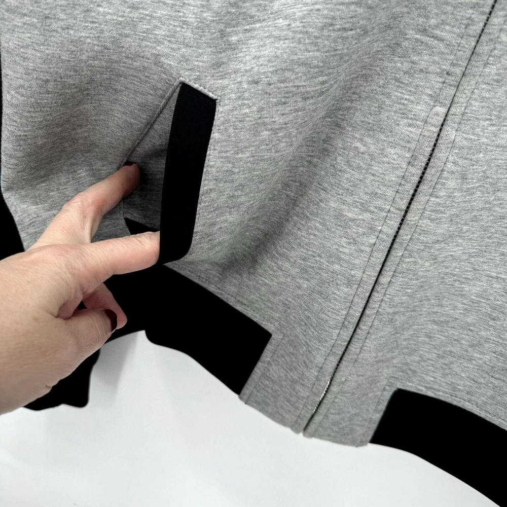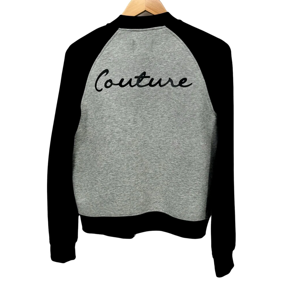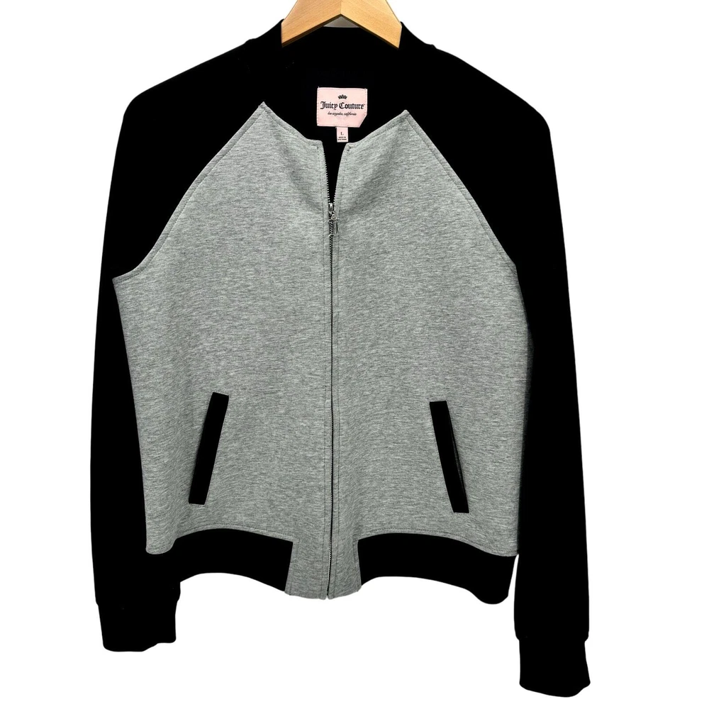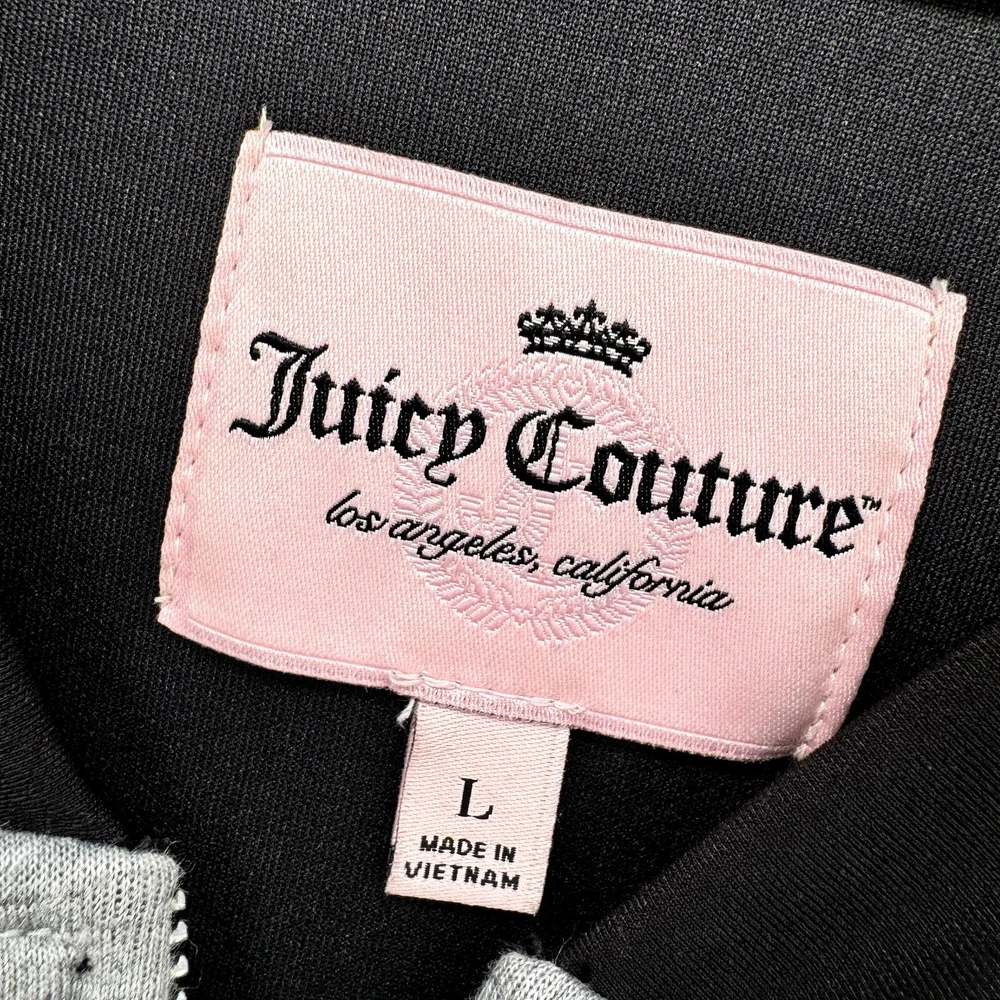 Juicy Couture Jacket Womens Large Gray Black Full Zip Logo Back + Pockets Cropped Very good condition, see all pictures for views. •Pit to pit: 20" •Shoulder to hem: 24" Ships out same day or next open postal day. Thank you for your purchase, we appreciate you!