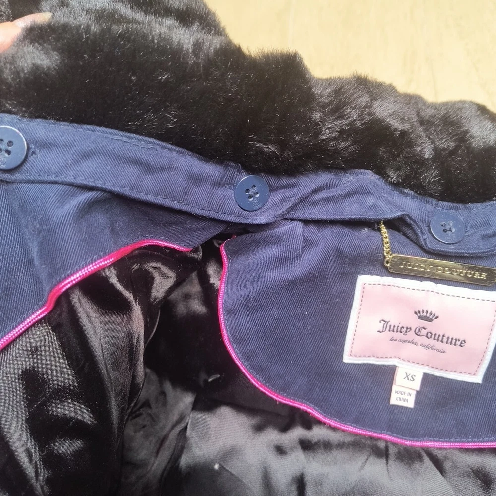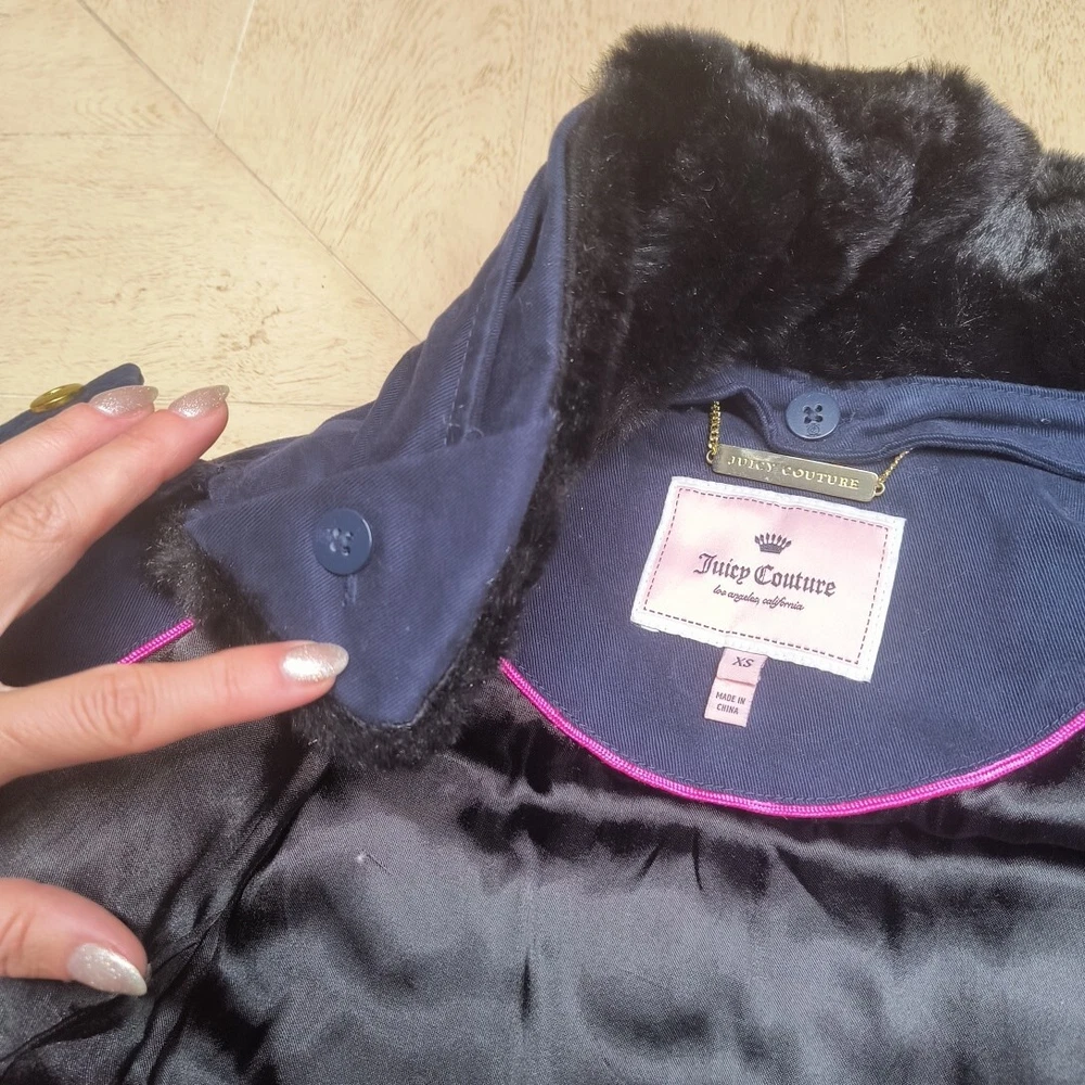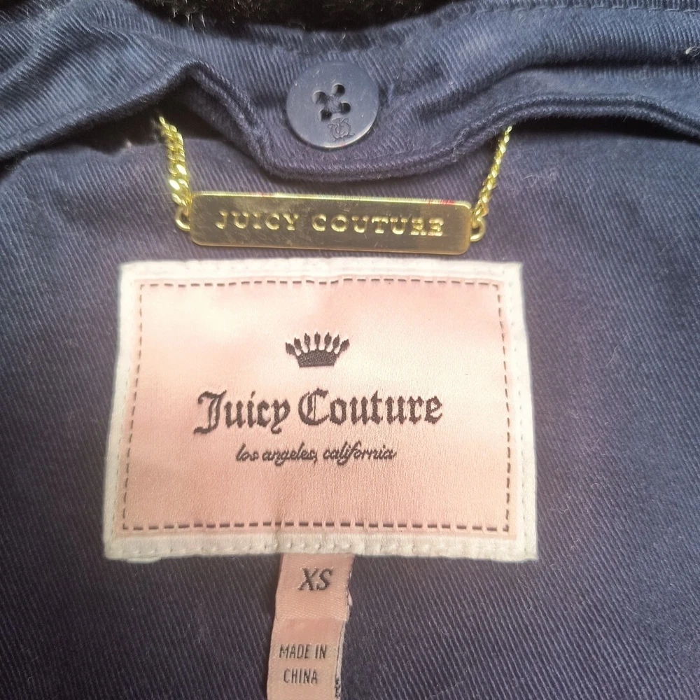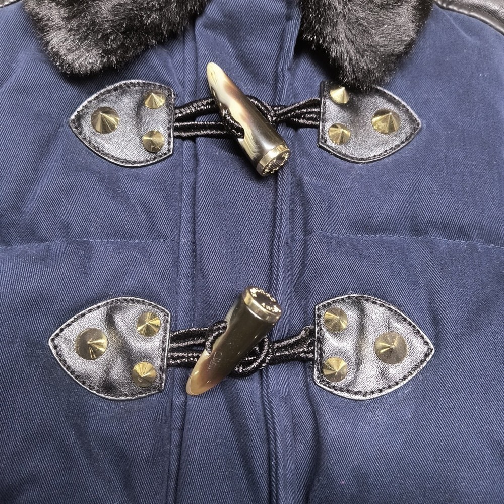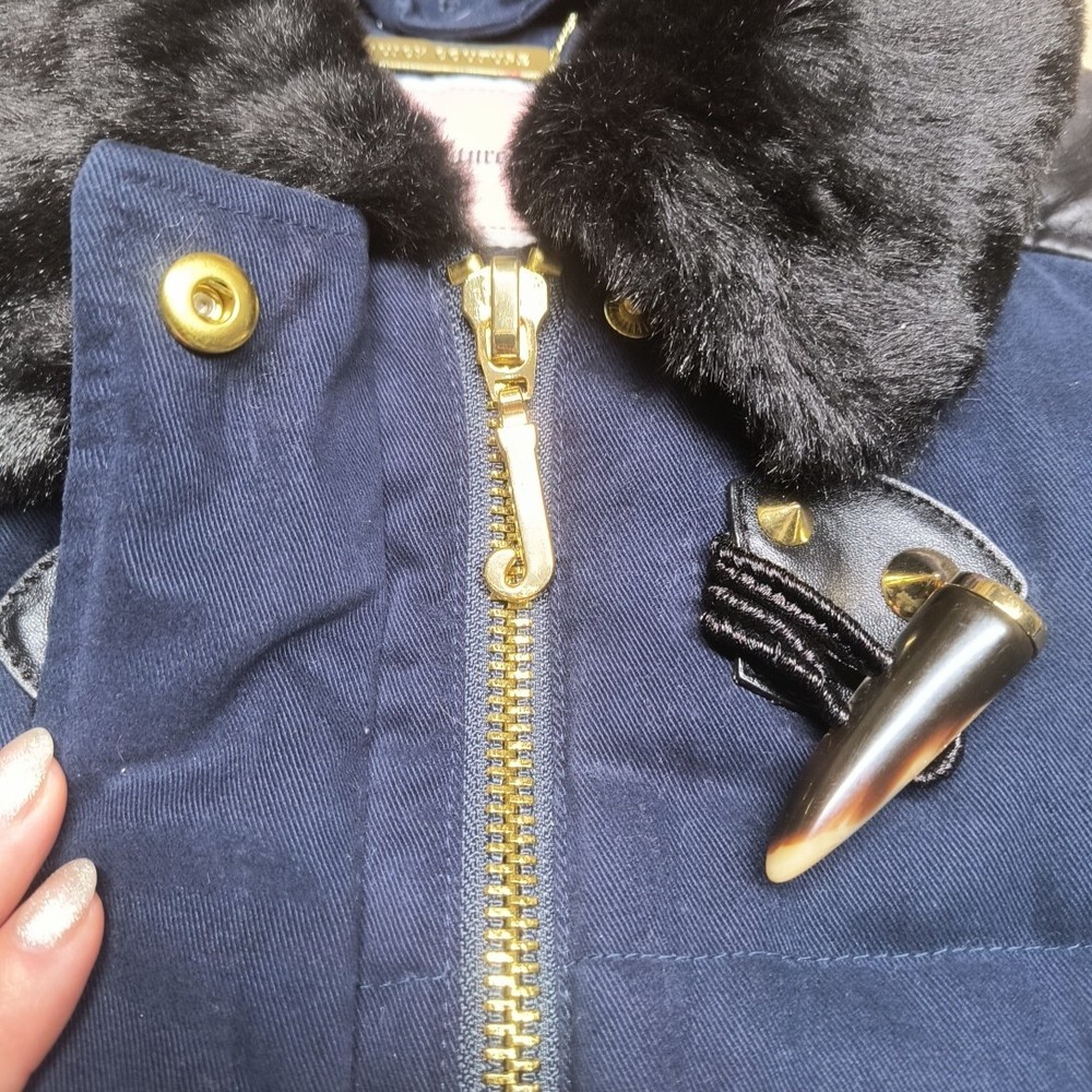 Awesome Y2K juicy couture women's coat in size XS. This coat is like 10 different looks in one. First of all, it's a puffer coat with down feather fill. It has a removable faux fur collar and vegan leather detail at the shoulders and on the toggles. The toggles themselves are studded with gold pyramid studs. The first itself is navy blue and grey sturdy. It's a warm coat. Definitely fits a little slim. Condition note- I loved this coat and wore it. So there is some wear. The vegan leather is cracking a bit at the shoulders and back. Also, on the bottom toggle the gold back is missing. I've put pictures in the listing showing this. Take a look. Otherwise it's an awesome coat!