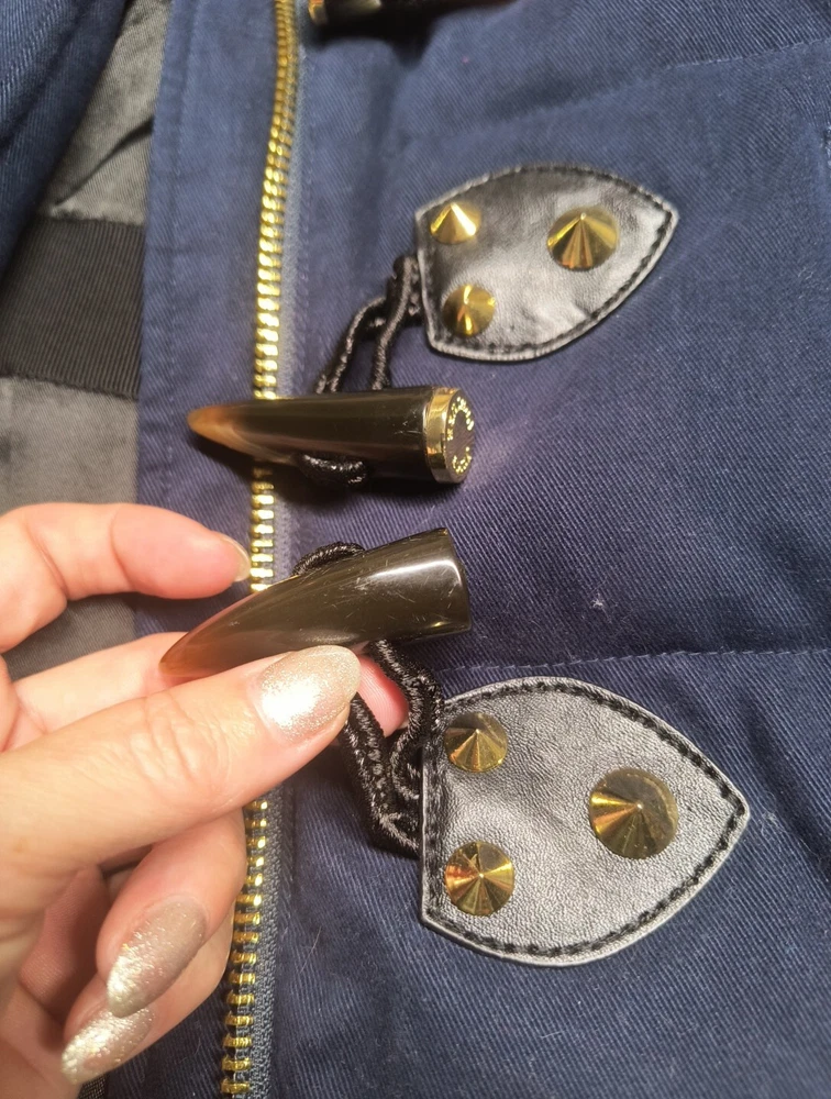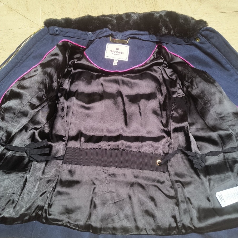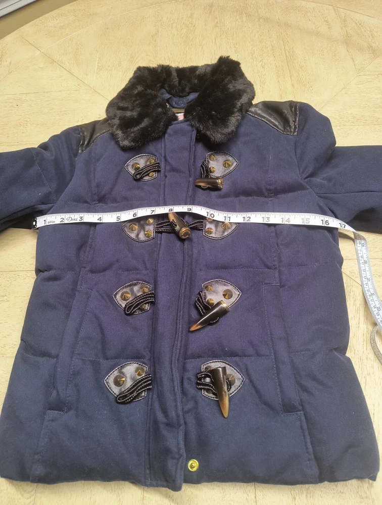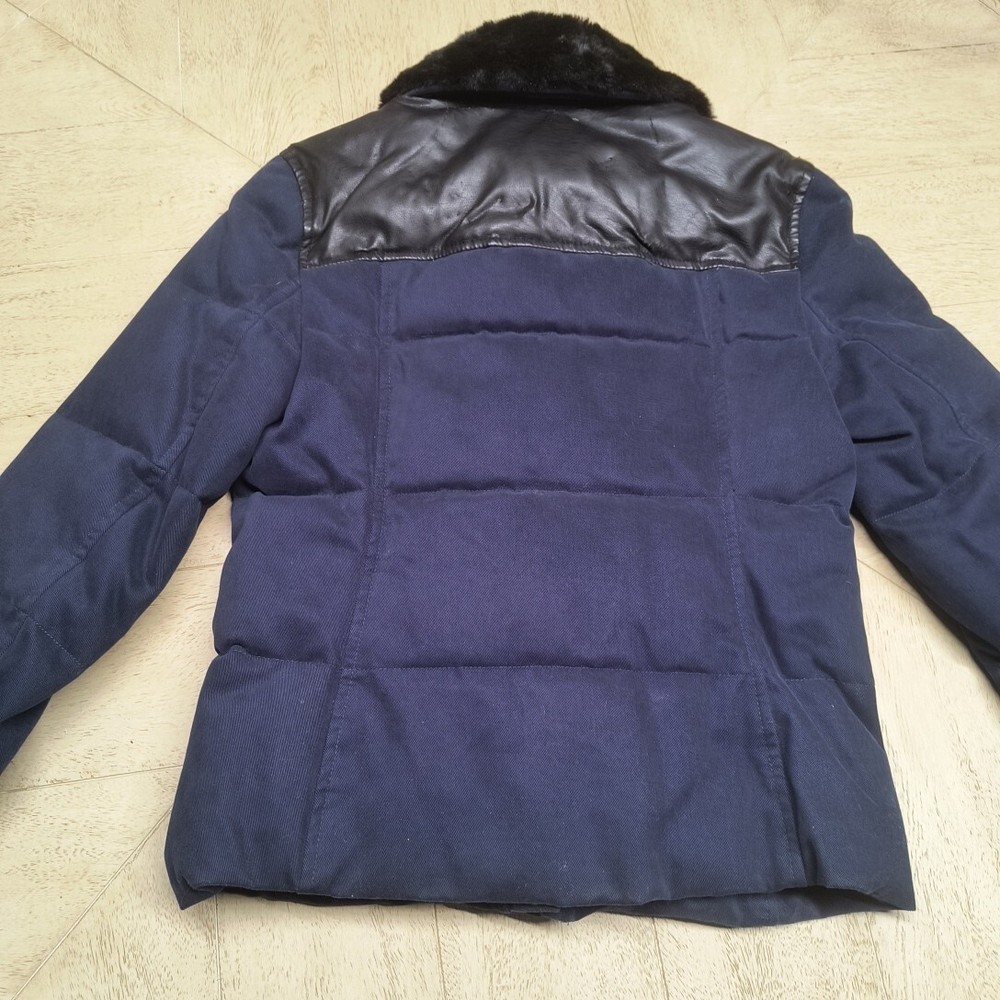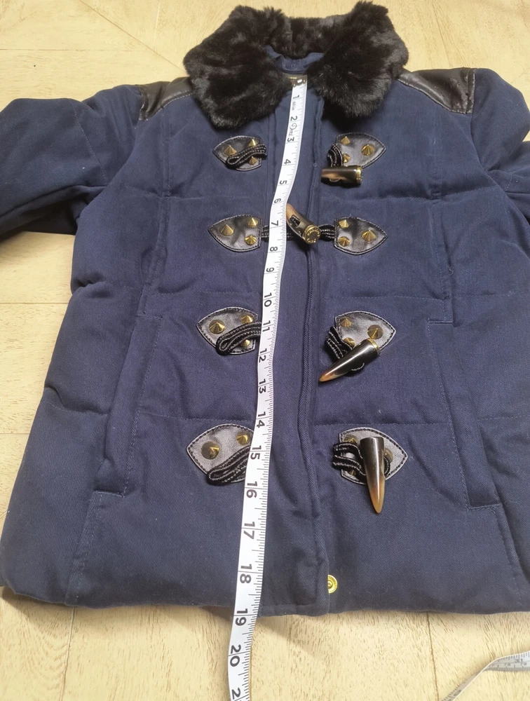 Awesome Y2K juicy couture women's coat in size XS. This coat is like 10 different looks in one. First of all, it's a puffer coat with down feather fill. It has a removable faux fur collar and vegan leather detail at the shoulders and on the toggles. The toggles themselves are studded with gold pyramid studs. The first itself is navy blue and grey sturdy. It's a warm coat. Definitely fits a little slim. Condition note- I loved this coat and wore it. So there is some wear. The vegan leather is cracking a bit at the shoulders and back. Also, on the bottom toggle the gold back is missing. I've put pictures in the listing showing this. Take a look. Otherwise it's an awesome coat!