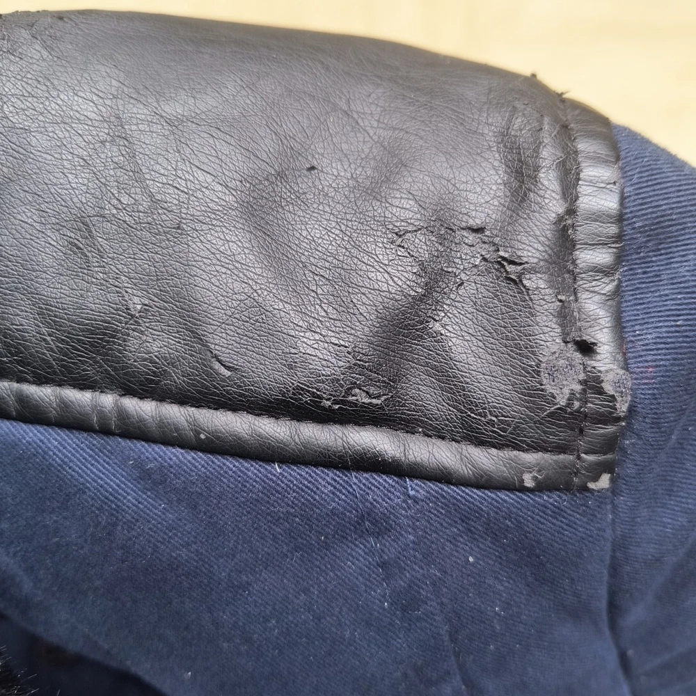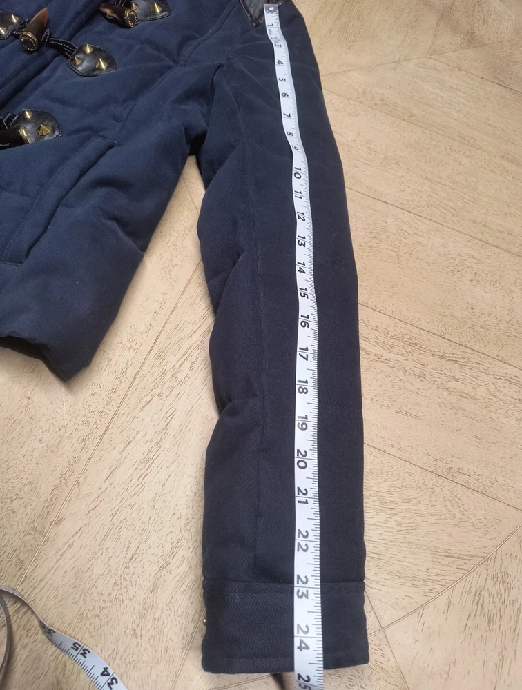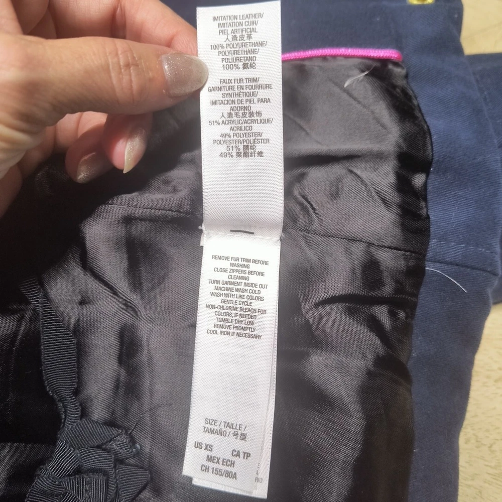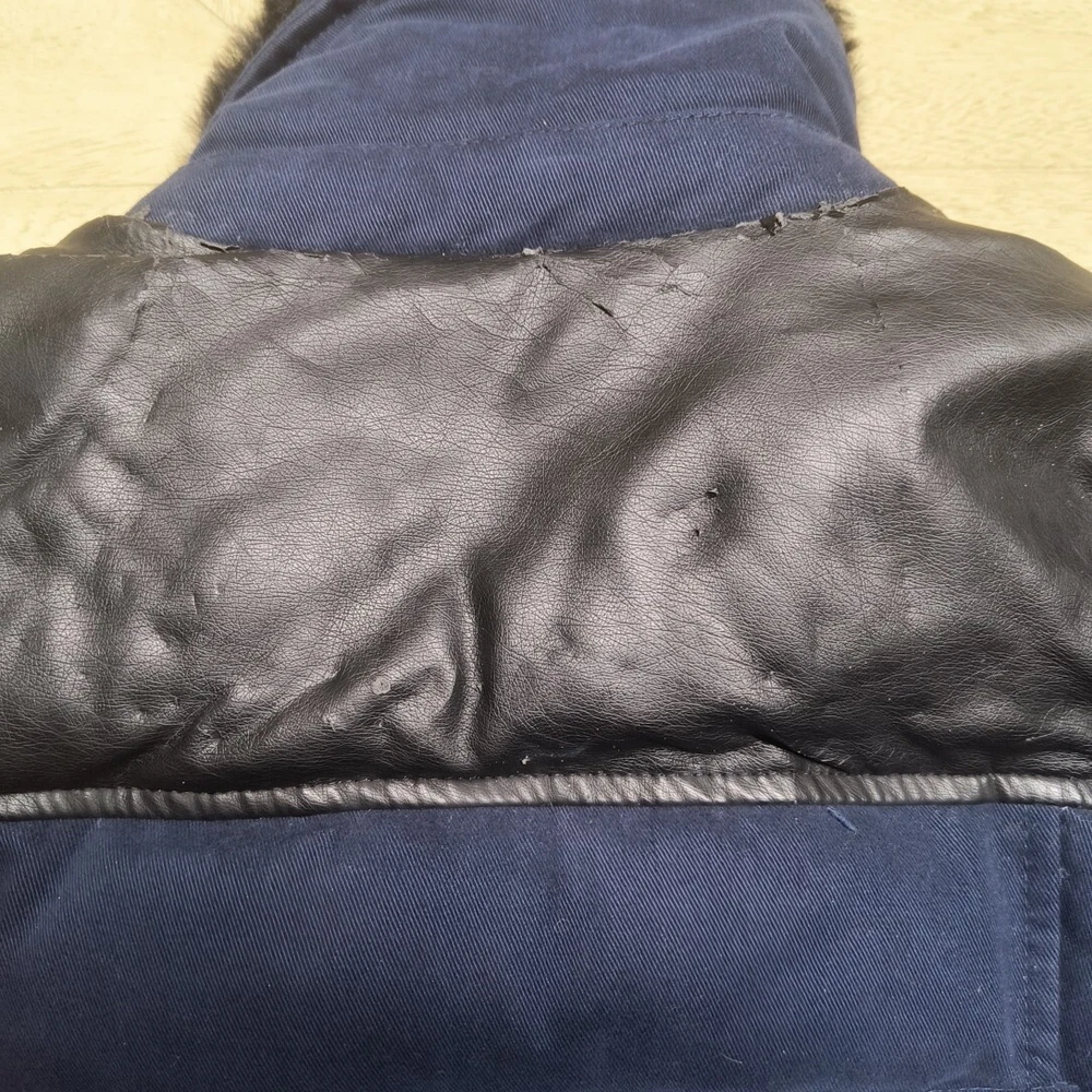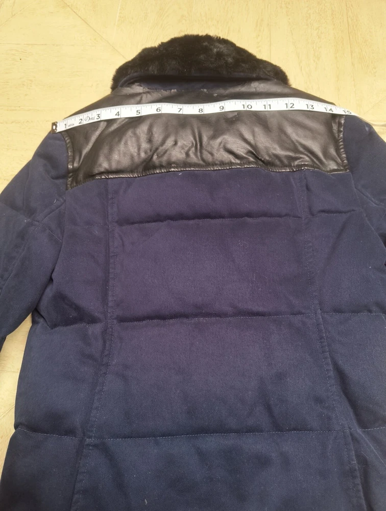 Awesome Y2K juicy couture women's coat in size XS. This coat is like 10 different looks in one. First of all, it's a puffer coat with down feather fill. It has a removable faux fur collar and vegan leather detail at the shoulders and on the toggles. The toggles themselves are studded with gold pyramid studs. The first itself is navy blue and grey sturdy. It's a warm coat. Definitely fits a little slim. Condition note- I loved this coat and wore it. So there is some wear. The vegan leather is cracking a bit at the shoulders and back. Also, on the bottom toggle the gold back is missing. I've put pictures in the listing showing this. Take a look. Otherwise it's an awesome coat!