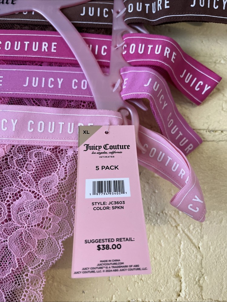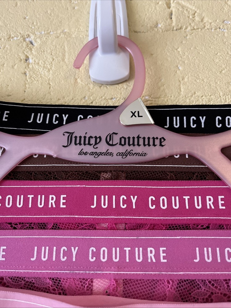 Add a touch of femininity to your lingerie drawer with this gorgeous set of Juicy Couture thongs in petal pink powder pink. Made with lightweight and stretchy lace fabric, these thongs are breathable, sheer and perfect for everyday wear. The pack includes 5 thongs, all in size XL, and they are perfect for women who love the thong/string style. These panties are a must-have for any woman who wants to feel comfortable and stylish at the same time. The brand Juicy Couture is known for its quality and design, and these thongs are no exception. The pink color and lace fabric make them perfect for any occasion, whether you're going to a party or just lounging at home. Don't miss the chance to add these beautiful thongs to your collection!