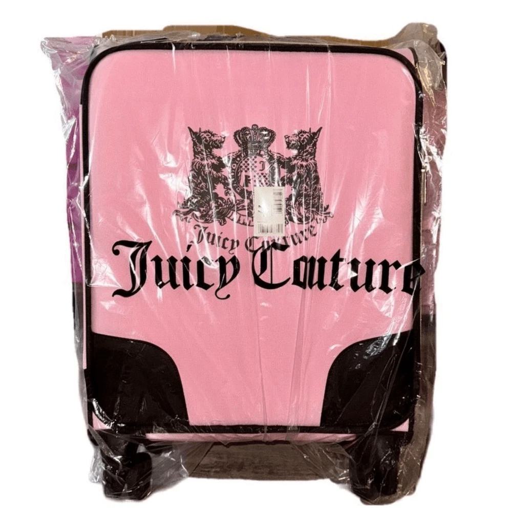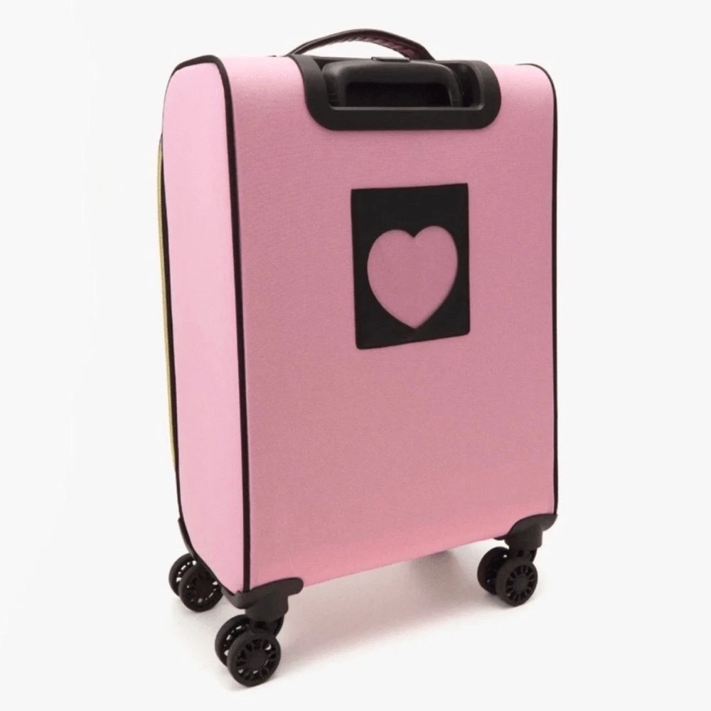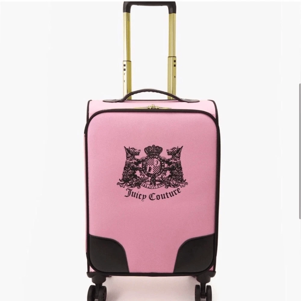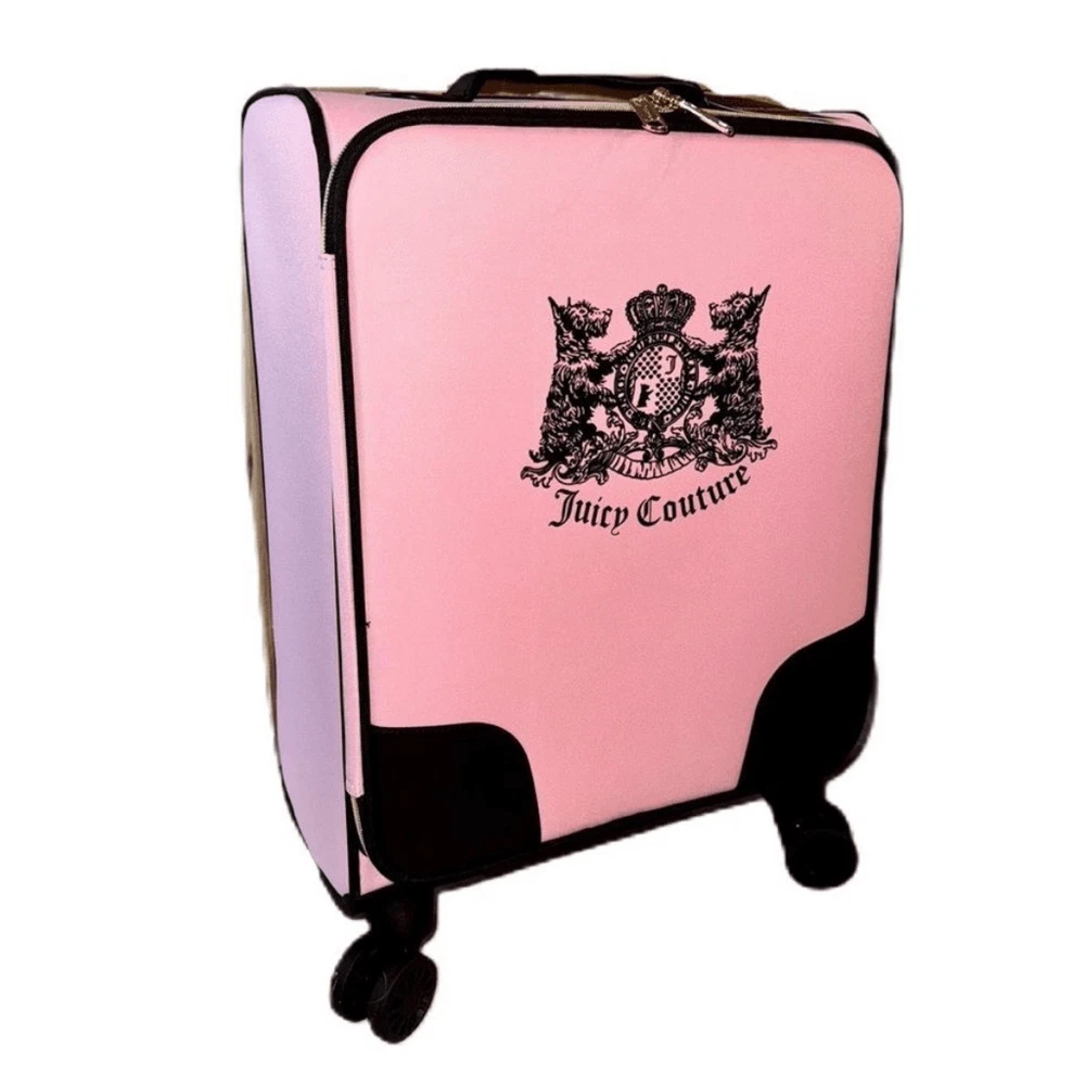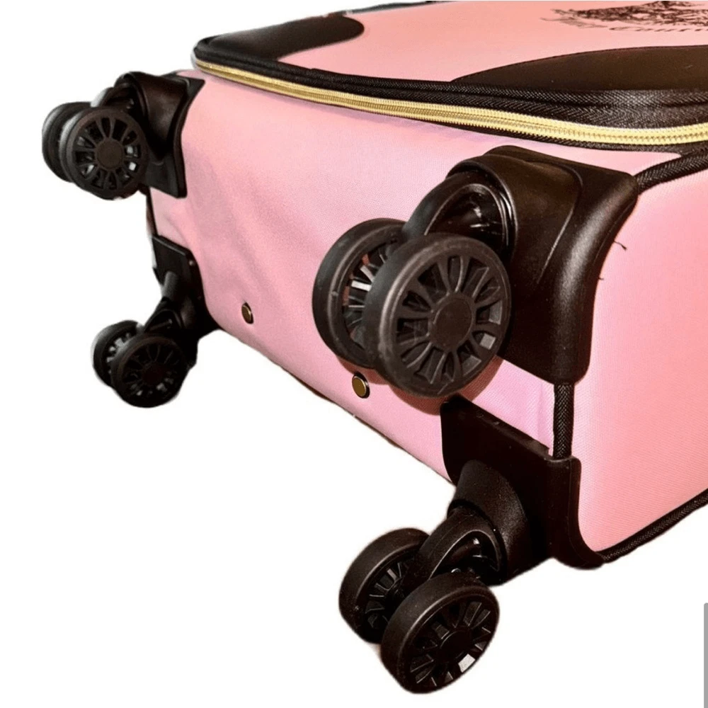NWT - Juicy Couture Pink Twig Dog Carry On 21” Luggage 8 Wheeled Spinner Suitcase. Very HTF and RARE JC carry-on only sold overseas. A stylish wheeled piece of luggage in a soft pink color and perfectly sized to carry-on your flight. Made of high-quality textile material, it provides durability and elegance. The thoughtfully designed interior allows for convenient and secure organization. BRAND NEW, never been used, flawless condition. •Pink Fabric Exterior w/ Black Logo •4 Double Swivel Wheels •Telescopic Handle •Gold-Tone Hardware •Double Zipper Closure •Logo Print Fabric Lined Interior •2 Clothing Safety Belts / Buckle Straps •Zip-Close Compartment •Measures Approx. 14.0"L x 21.0”H x 8.0"D •Approx. Weight: 4.5 LBs
