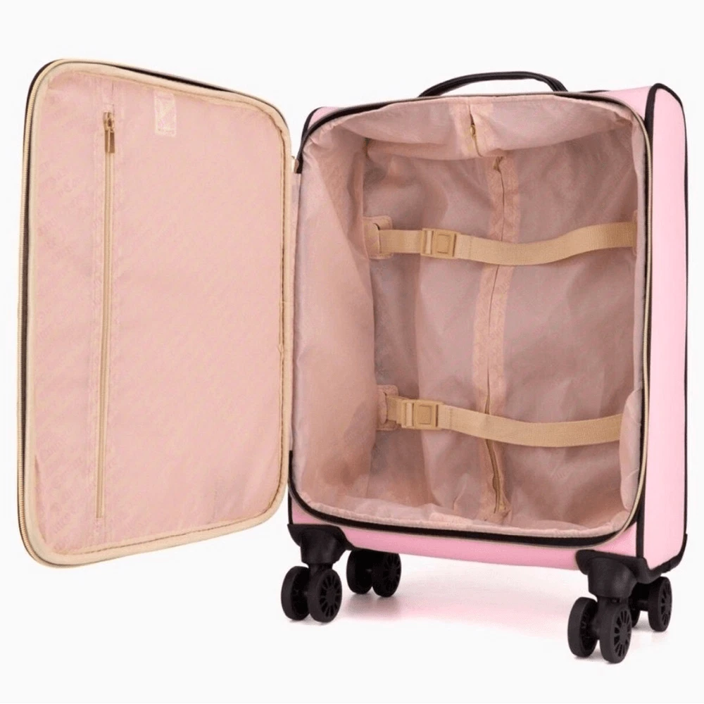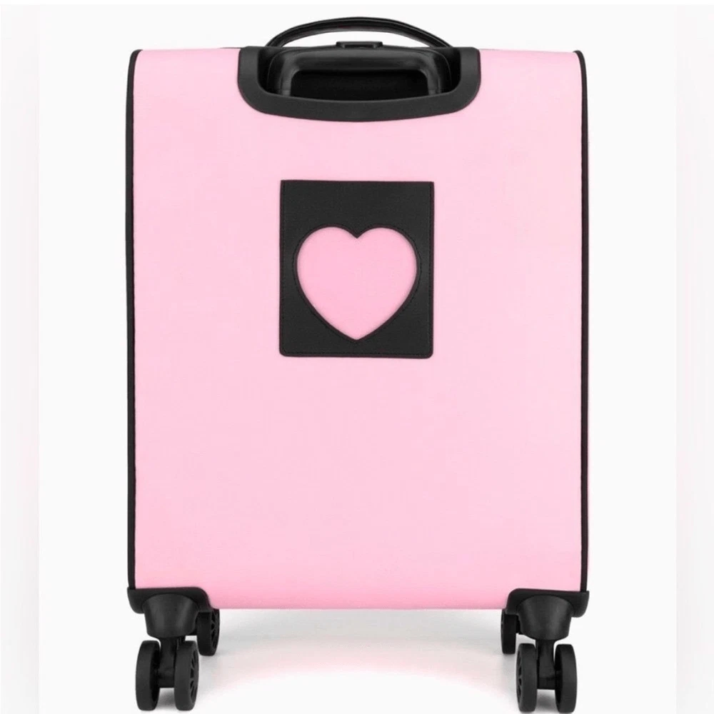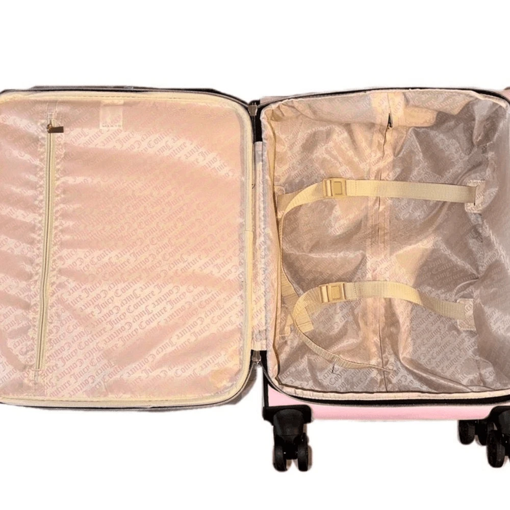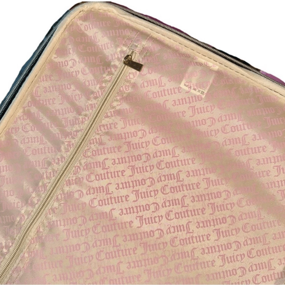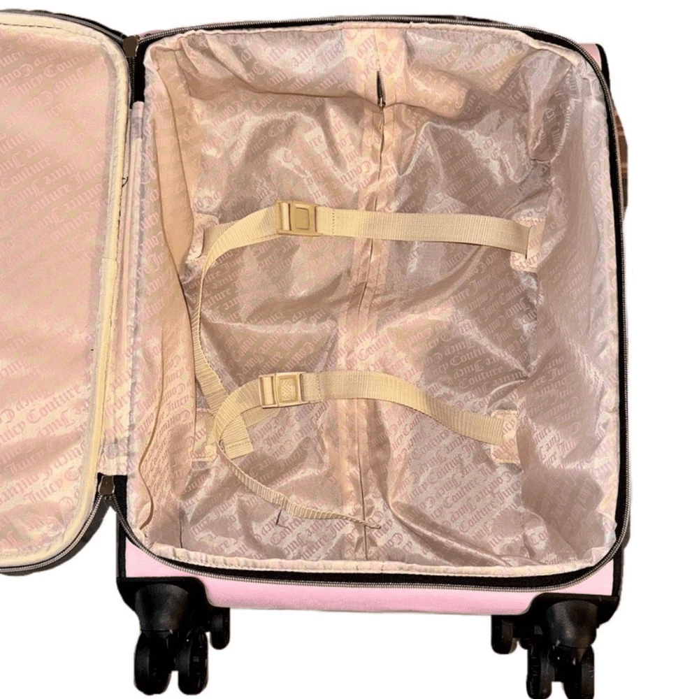 NWT - Juicy Couture Pink Twig Dog Carry On 21” Luggage 8 Wheeled Spinner Suitcase. Very HTF and RARE JC carry-on only sold overseas. A stylish wheeled piece of luggage in a soft pink color and perfectly sized to carry-on your flight. Made of high-quality textile material, it provides durability and elegance. The thoughtfully designed interior allows for convenient and secure organization. BRAND NEW, never been used, flawless condition. •Pink Fabric Exterior w/ Black Logo •4 Double Swivel Wheels •Telescopic Handle •Gold-Tone Hardware •Double Zipper Closure •Logo Print Fabric Lined Interior •2 Clothing Safety Belts / Buckle Straps •Zip-Close Compartment •Measures Approx. 14.0"L x 21.0”H x 8.0"D •Approx. Weight: 4.5 LBs