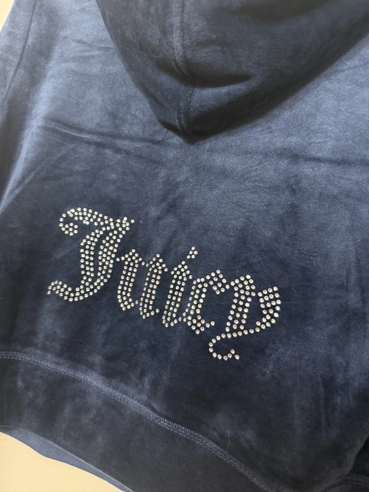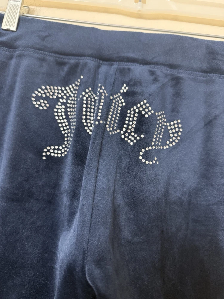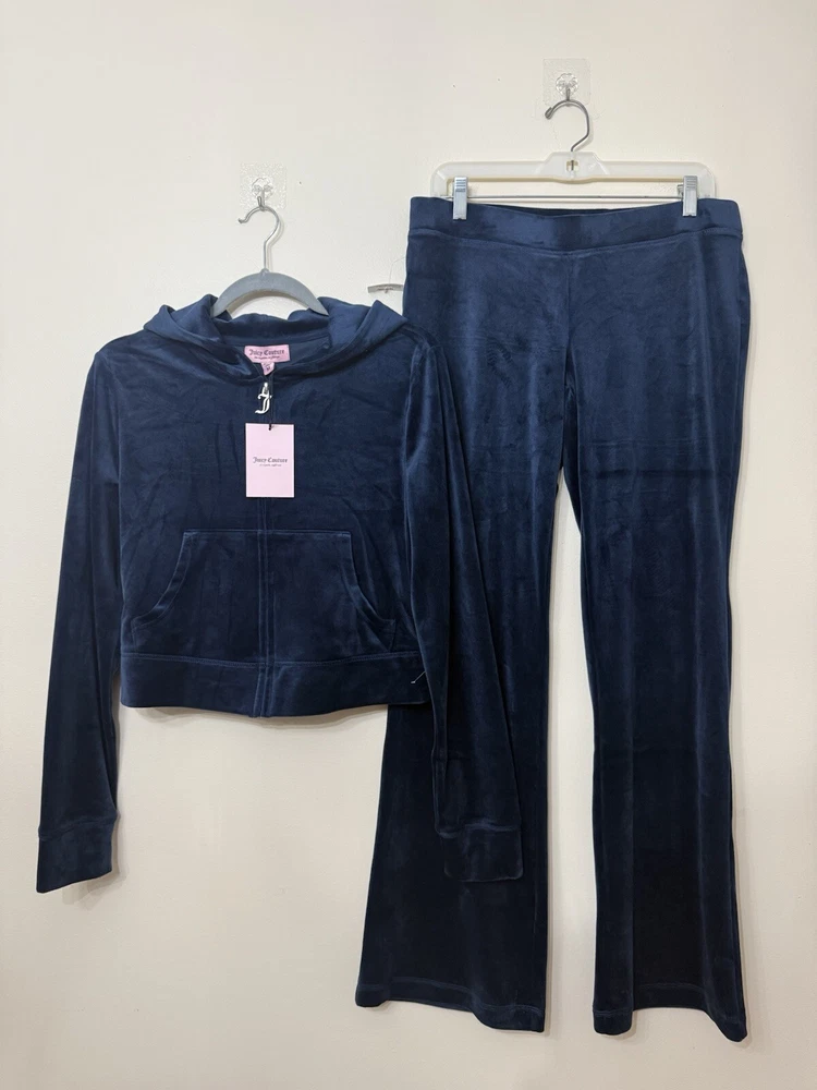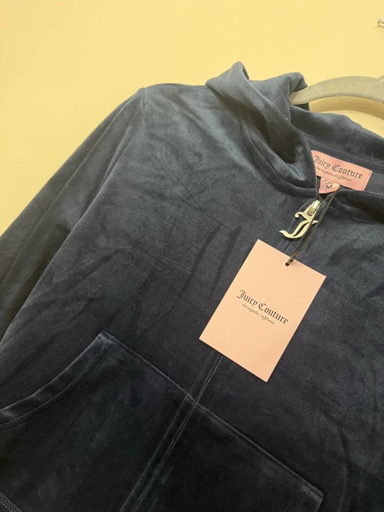 This is a Juicy Couture 2-piece tracksuit set for women in size M. The set includes a regal blue velvet jacket with long sleeves and matching pants. It is designed for activewear, featuring a designer 90s athleisure style. The set is ideal for gym training, walking, or cross-training in all seasons. The set is brand new with tags, and the retail price is $199.