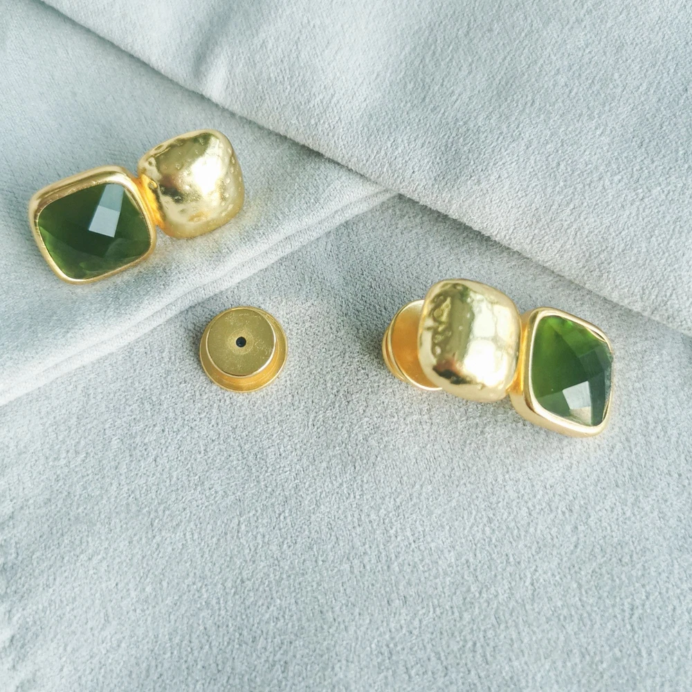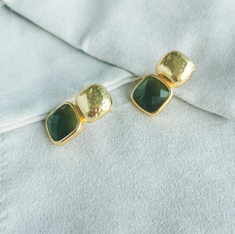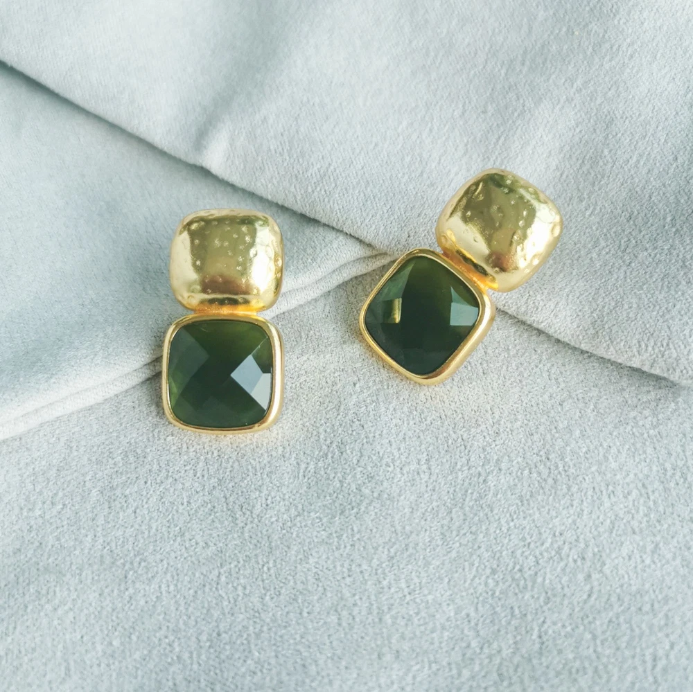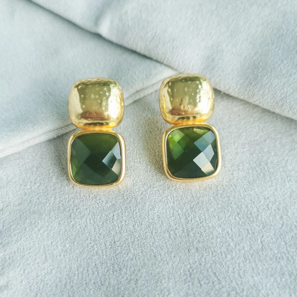1 inch length Without dust bag 24K gold plate imported glass The stacked squares of these earrings—a lightly hammered top above the cushion shape gemstone underneath—comes in a spectrum of sparkling colors.