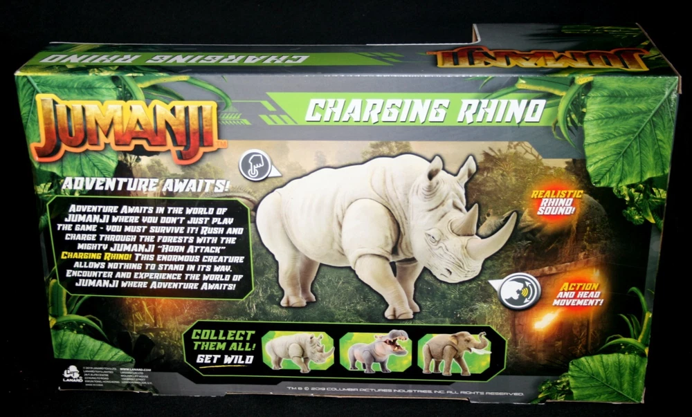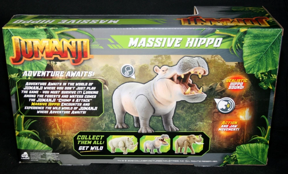 Walmart exclusive Lanard 2019 Jumanji figure lot of Charging Rhino and Massive Hippo new in package. Figures make realistic sound and their head moves when pressing the button on their back. Hippo figure measures approx. 11" in length and uses 3 AG13/LR44 batteries (included). Thanks for looking and check out my store. I ship next business day after payment is received.
