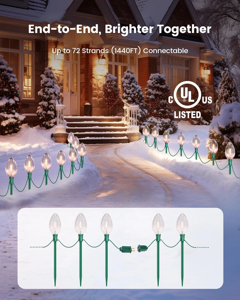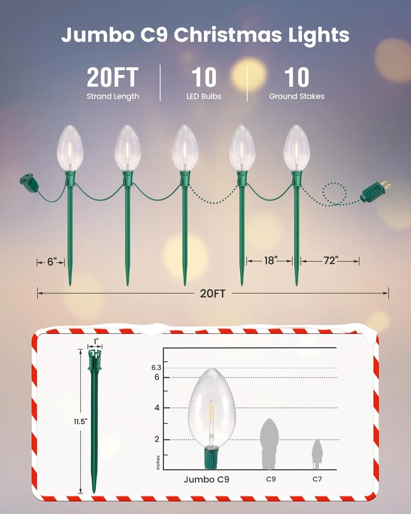 Illuminate your festive season with our Jumbo C9 Christmas Pathway Lights. Stretching an impressive 20 feet, this enchanting display features 10 large, vibrant C9 LED bulbs, each equipped with an E17 base, ensuring a stunning visual impact for any outdoor setting. Our pathway lights are not only a feast for the eyes but also designed for maximum energy efficiency. These warm white lights will transform your driveway, walkway, sidewalk, and yard into a beautifully lit winter wonderland. With a UL Listing for safety and reliability, you can confidently connect up to 72 strands end-to-end, allowing for seamless integration into your existing holiday décor. The package includes 10 sturdy ground stakes, making setup a breeze whether you choose to stake them down or hang them up. Constructed from all-weather resistant PC material, these outdoor lights are built to withstand the elements, making them an ideal choice for Christmas yard decorations and general outdoor Christmas décor. Perfect for decorating houses, roofs, trees, or paths, the Jumbo C9 Christmas Pathway Lights are sure to create a magical holiday atmosphere for your family and friends. Elevate your outdoor Christmas decorations with our Jumbo C9 lights—where size, color, and quality meet to deliver a spectacular festive experience! Vibrant Holiday Glow: Light up your outdoor space with 20FT of Jumbo C9 Christmas pathway lights. Giant warm white LED bulbs are perfect for making your yard, driveway, and walkways festive and welcoming this Christmas Energy-Saving LEDs: The giant Christmas lights are equipped with 10 jumbo C9 LED bulbs, providing bright, eco-friendly lighting, using less electricity so you can enjoy a stunning holiday display without worrying about your energy bill Easy Setup for Christmas Decor: The outside Christmas lights include 10 durable 11.5" ground stakes for fast installation. Whether lining sidewalks, driveways, walkways, or hanging on your roof or trees, setting up your holiday lights is a breeze. Suitable for any Christmas lights with an E17 socket Built for Any Weather: Made with tough PC materials, these Christmas lights outdoor are weather-resistant and built to handle snow, rain, or wind, so your decorations stay bright all season long. These big Christmas lights are perfect for indoor and outdoor use Connect for a Dazzling Display: UL Listed and designed for convenience, you can connect up to 72 strands of driveway Christmas lights end-to-end, making it easier than ever to create a dazzling, uninterrupted Christmas yard display