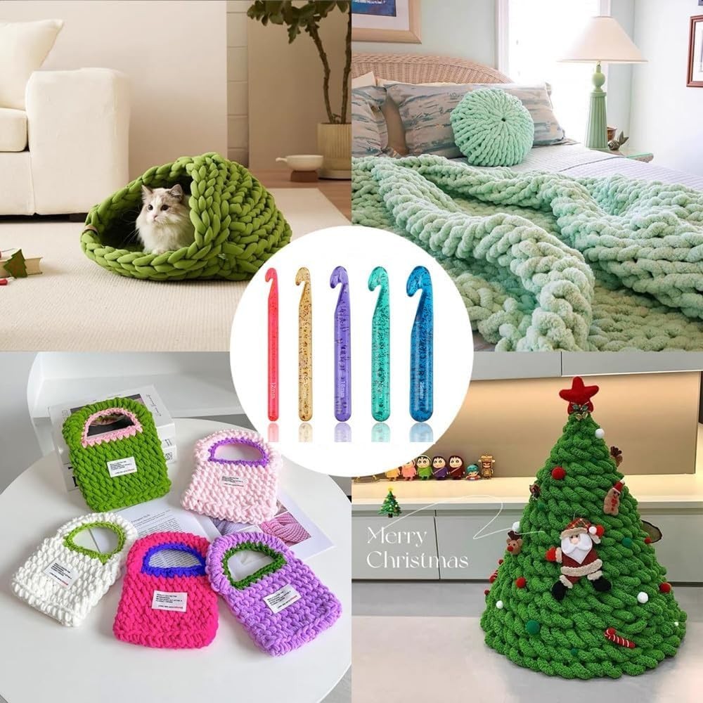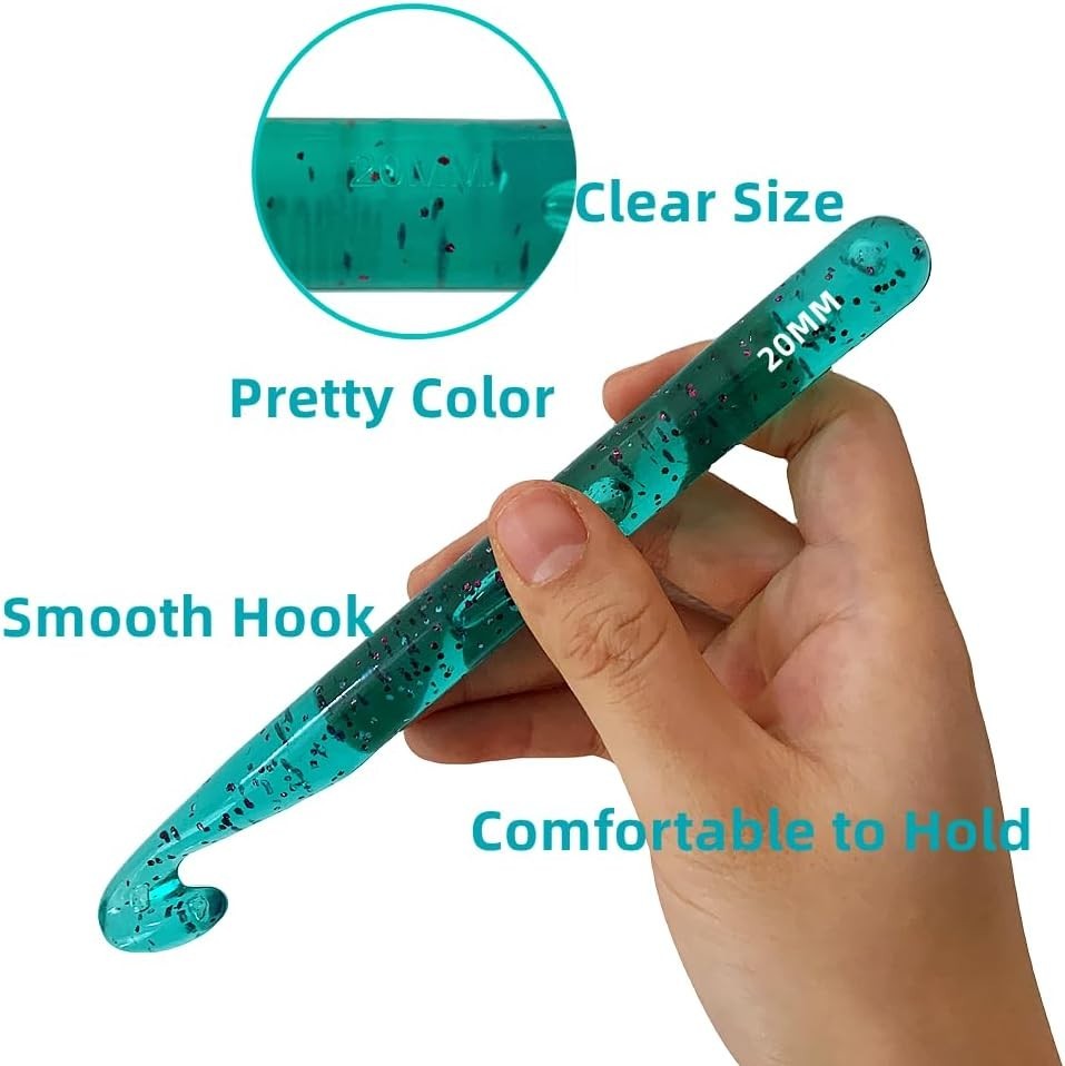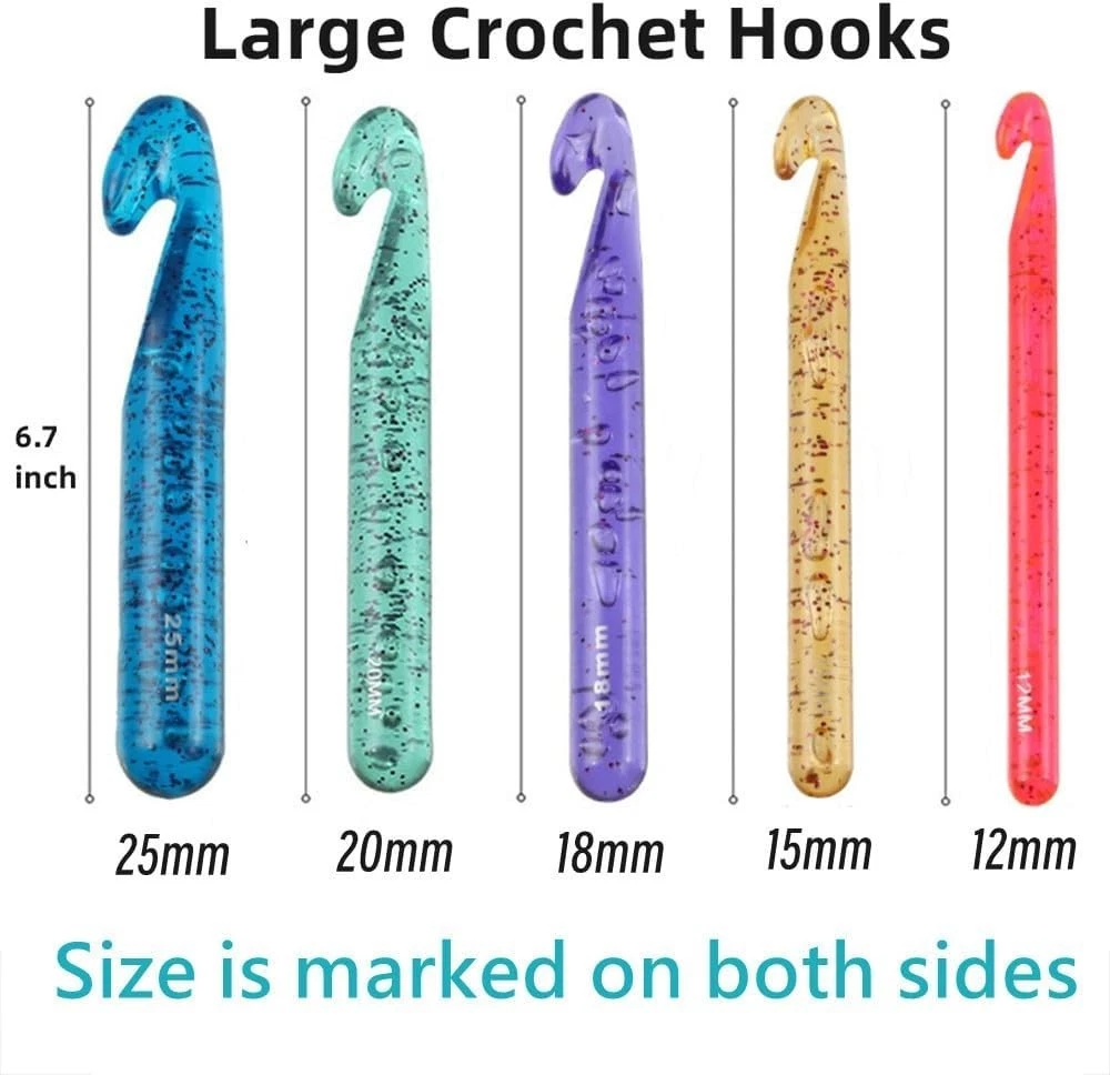 Large Crochet Hooks,25mm 20mm 18mm 15mm 12mm Features: Large Crochet Hooks Set:The crochet hook set includes 5 large crochet hooks(12mm 15mm 18mm 20mm 25mm),6 yarn needles with 10 stitches markers.Crochet hooks are from 12mm to 25mm,suitable for chunky yarn Perfect Gift:The crochet hooks and accessories are packed in a compact case,portable and easy to store.The color of the crochet hooks is pretty.The crystal-like appearance offers good mood.Crochet hooks are perfect gifts for everyone who loves crocheting Easy to Use:Our smooth huge crochet hooks won't snag yarn and comfortable to hold.Crochet hooks are perfect to make large blankets,pet mats and other large projects and more Enjoy Crocheting:The crochet hook kit includes 25 mm 20 mm 18 mm 15 mm 12 mm crochet hooks.Different sizes meet your basic needs.The size is marked on both sides of the crochet hook,easy to identify Quality service:We never stop striving for better quality and products.If you are not satisfied with the crochet hook set,please feel free to contact us,we will provide you with the best solution