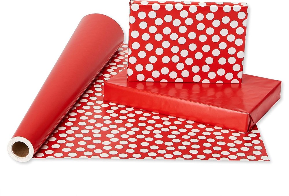 Jumbo Reversible Red Wrapping Paper Roll for Christmas, Valentine's Day or Any Occasion 175 sq. ft., 1 Extra Large Roll-30 in. x 70 ft. White Polka Dots Includes 1 jumbo roll of reversible wrapping paper Roll measures 30 inches wide by 70 feet, 175 total square feet and can wrap approximately 42 shirt boxes that measure inches x inches x inches. Made with heavyweight and durable paper to avoid tearing easily while gift wrapping. Recyclable and assembled in the USA. This wrapping paper features a solid red color on one side and white polka dots on a red background on reverse Perfect for wrapping any size gift for birthdays, graduations, parties, celebrations and holidays such as Christmas and Valentine's Day. Suitable for kids, teens and adults Make holidays ho-ho-ho happy and everyday celebrations extra cheerful with stylish gift wrapping paper! This reversible roll wrap design features a solid red pattern on one side and festive white polka dots on the other side. The mega roll features quality, durable paper in a continuous roll (no creases!) that won’t tear, isn’t see-through and is easy to cut, wrap and fold over lots and lots (as many as 42 boxes) of gifts. Use the wrapping paper on its own for a clean look or get fancy with gift-wrapping ideas—add a gift tag, tissue paper shapes, ribbons and bows (all sold separately). Or use multiple patterns on one package by creating unique paper folds and pockets that add dimension and offer fun ways to attach a card or small gift. Recyclable wrapping paper is great for crafts, too! With both holiday and winter looks, this two-sided paper design is perfect for Christmas wrap, winter birthdays and any occasion!