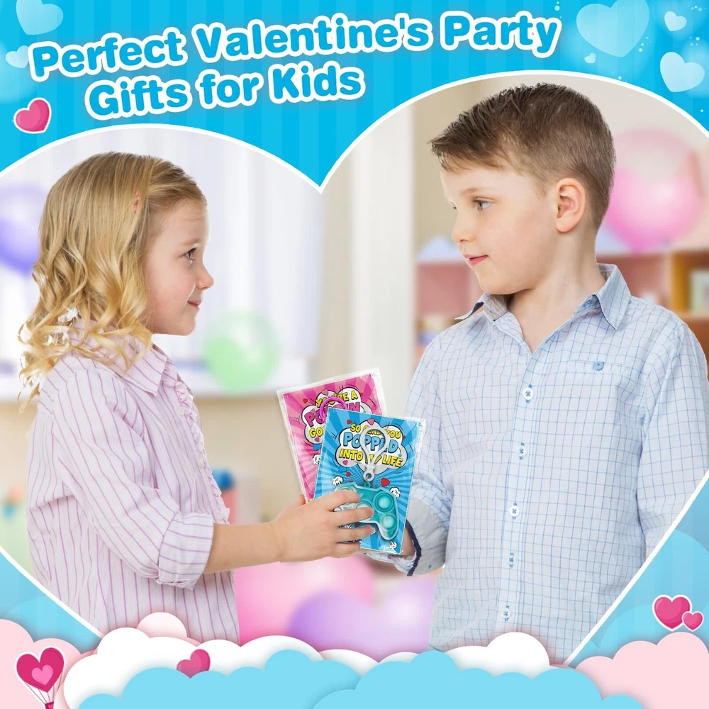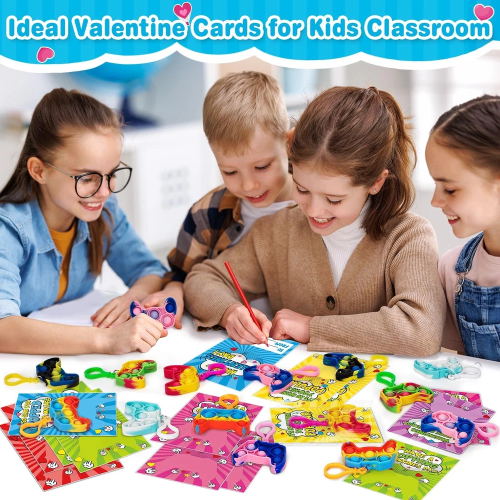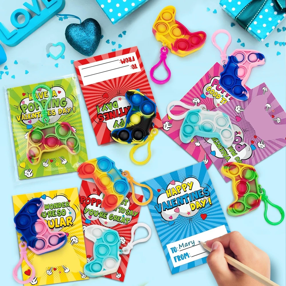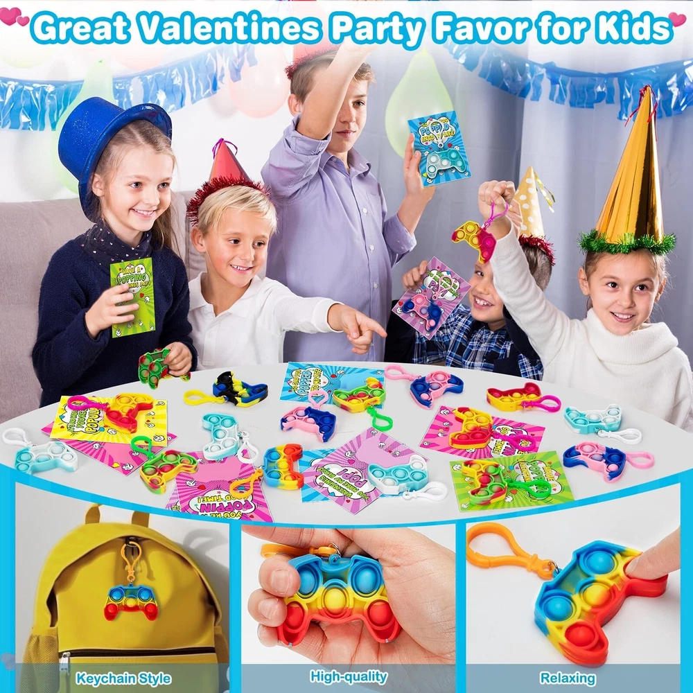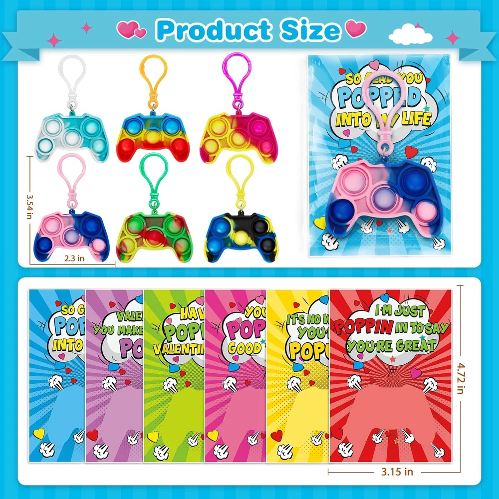 Jumlys Valentines Cards for Kids Classroom, 24 Pack Game Shape Pop Fidget Keychains Bulk, Valentines Gifts for Kids School, Ideal Exchange Prizes & Party Favors for Boys Girls Product Details Color: Multicolor Included Components: Paper Brand: Jumlys Item dimensions L x W x H: 1 x 0.3 x 1 inches Item Weight: 0.1 Pounds Product Dimensions: 1 x 0.3 x 1 inches Item Weight: 1.6 ounces Country of Origin: China Item model number: Valentine pop keychain Manufacturer recommended age: 36 months - 3 years Department: Unisex Kids Manufacturer: Jumlys Value Valentines Day Card Set For Kids - The package contains 24 cards with 6 different designs, and 24 pop fidget toys key chains with 6 colors. It is sufficient quantity can meet the needs of kids in various parties and is suitable for Valentine's Day gifts and classroom activity prizes, they will surprise the kids in Valentine's Day. Various Unique Designs - Our pop fidget toys key chains contain 6 different mixed color designs, and the cards are also designed with 6 different colors, which looks very colorful. Assembling the pop fidget toys key chains and cards together, the bright colors and unique designs immediately attract the attention of children, which is definitely an ideal choice for Valentine's Day gifts. Fun Toys for Boys and Girls - Our pop fidget key toy is made of high-quality materials, soft and flexible. Pressing it will be very relaxing, helping you get rid of stress, providing a pleasant and calming sensory experience, and the matching key chain can also be hung on school bags, keys, pencil cases, etc. Prepare this pop fidget key chain for your children and let them enjoy it at the Valentine's Day party. Ideal Valentines Day Exchange Gifts - Kids can write the name of the person they want to give on the card, and give these Valentine's Day cards to classmates, friends or family to express love for them. Let the children spend an unforgettable Valentine's Day together by exchanging Valentine's Day cards in class. Suitable For Many Occasion - This Valentines Day cards kit is perfect for children entertainment, kids Valentine's party favor supplies, preschool or elementary school classroom prize, school classroom gift exchange, class Valentine's event or any Valentine's occasions. Any child will be surprised and delighted to receive them.